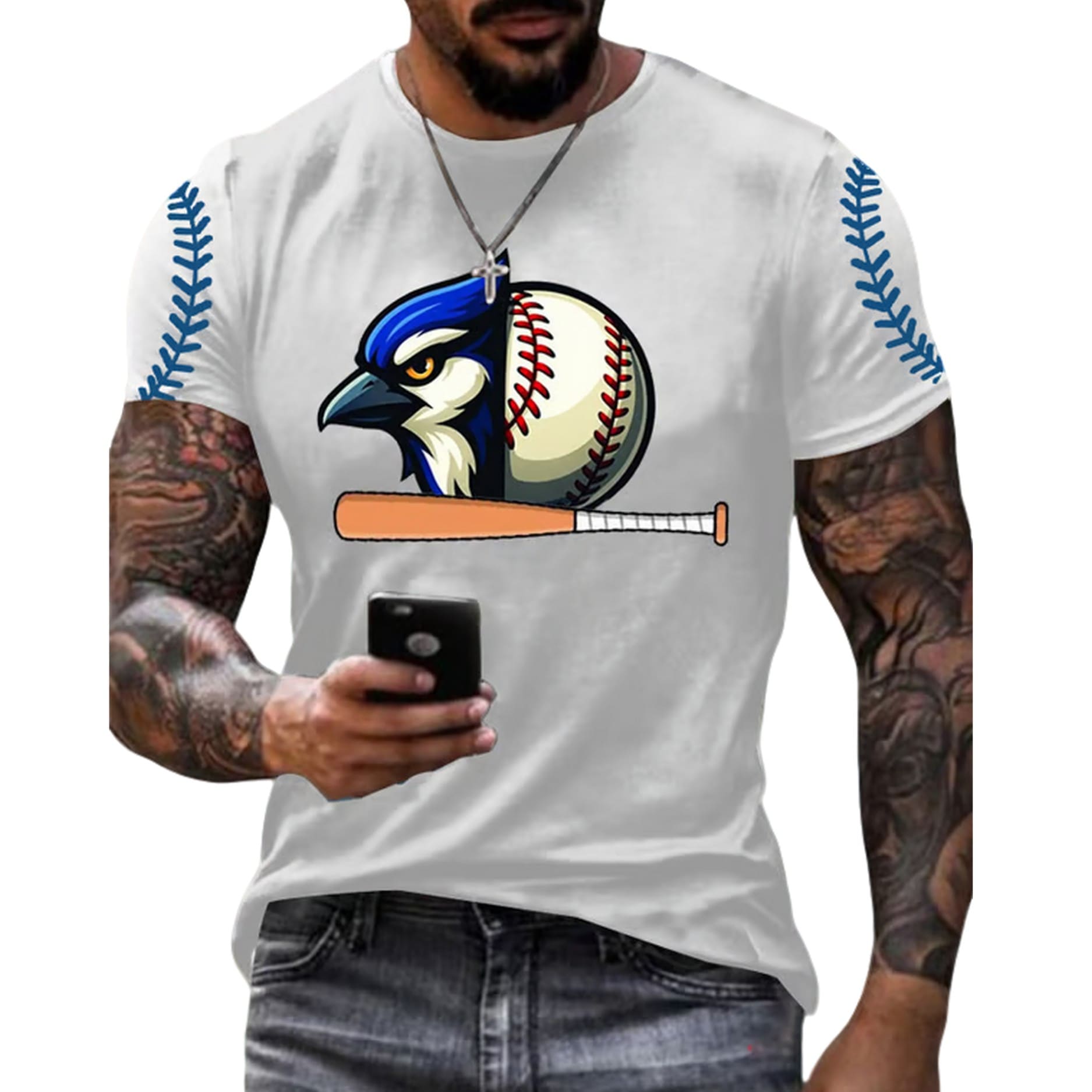 | Design Feature | All-over print featuring a stylized Blue Jay integrated into a baseball, plus blue baseball stitching details on the shoulders. |