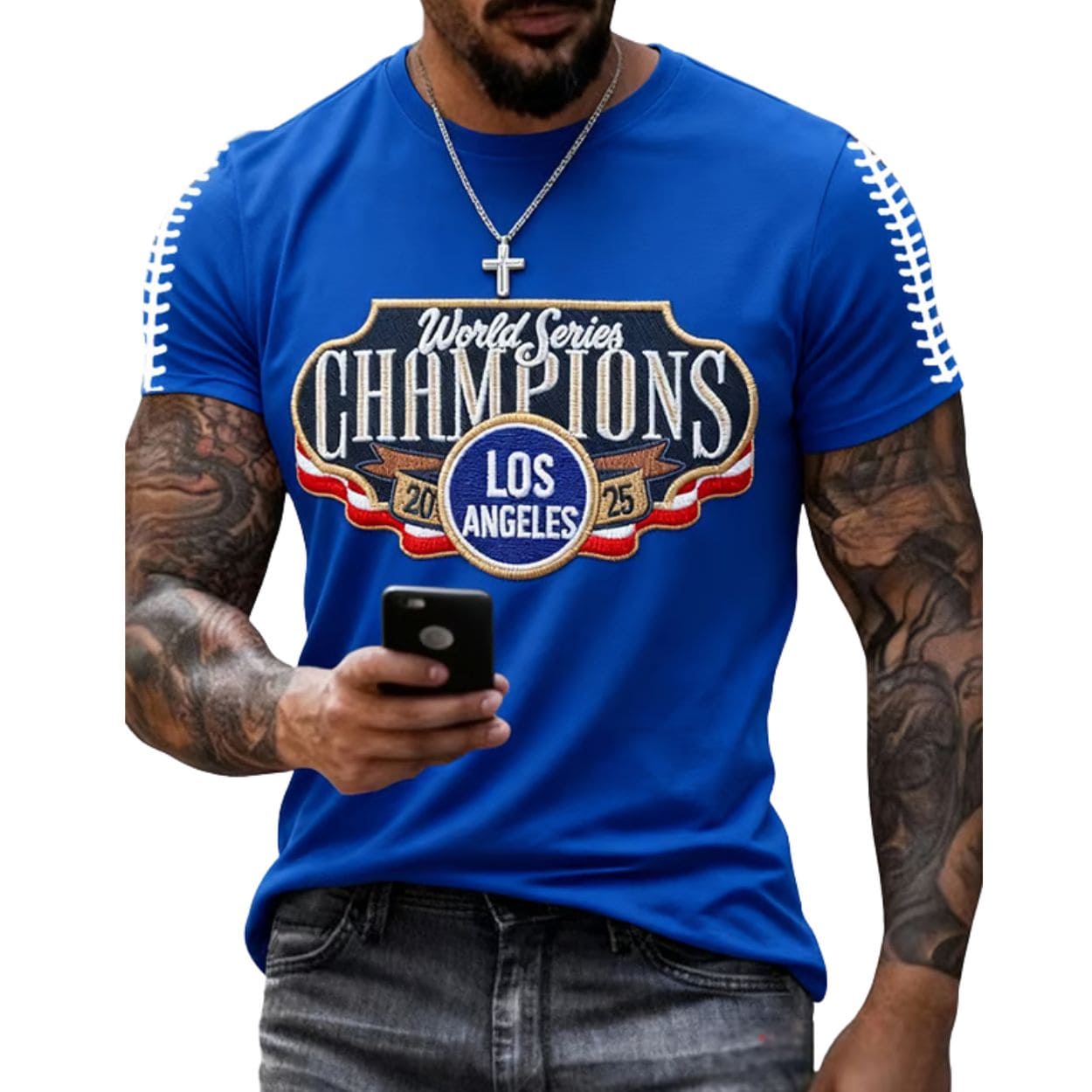 | Design Feature | Single-sided print on Royal Blue featuring the layered “World Series Champions 2025” crest with the Dodgers “LA” logo, and baseball stitching details on the shoulders. |