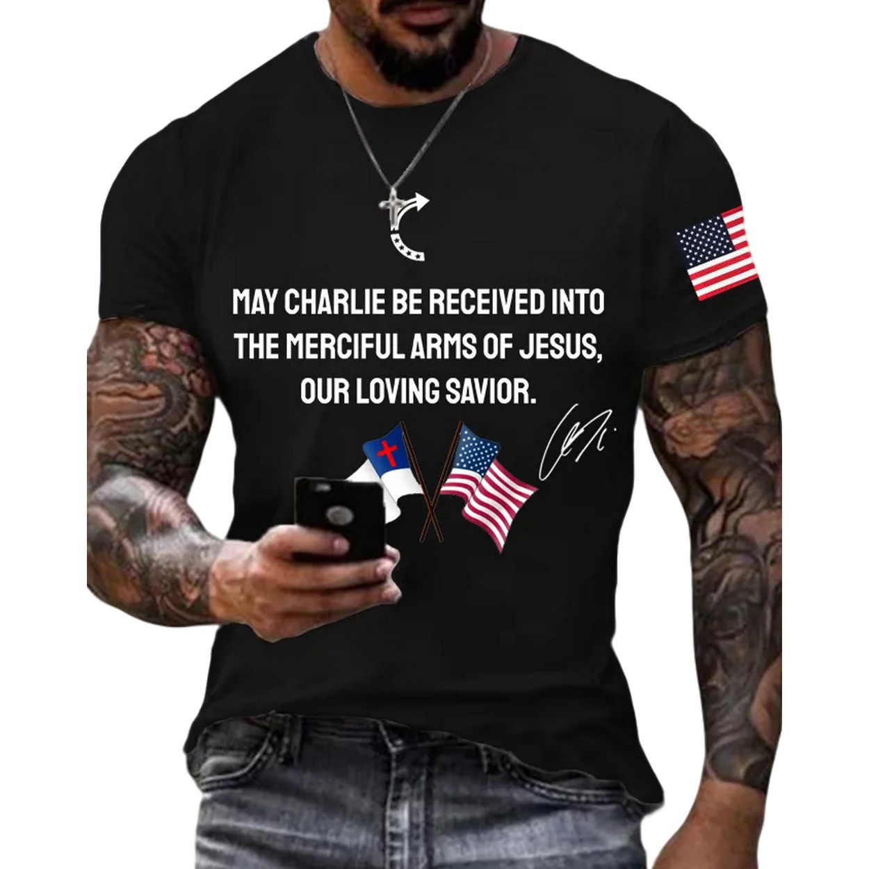 Honor a profound message with this exclusive “Men’s May Charlie be accepted into the compassionate arms of our loving Savior Jesus Charlie Kirk signed commemorative T-shirt”. The front of the shirt features a deeply moving message: “MAY CHARLIE BE RECEIVED INTO THE MERCIFUL ARMS OF JESUS, OUR LOVING SAVIOR.” Above this text, a subtle crescent symbol adds a unique design element.