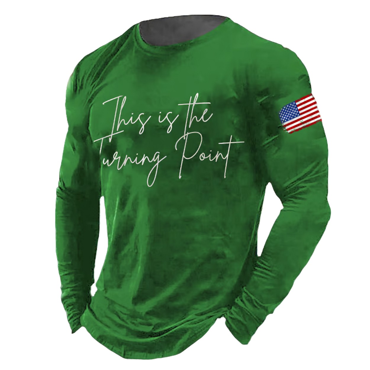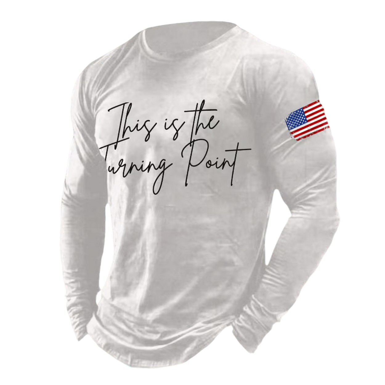This classic, retro-style long-sleeve T-shirt features the iconic phrase “This is the Turning Point” in elegant, flowing script across the chest. A bold American flag on the sleeve adds a touch of patriotism and pride. Made from soft, lightweight polyester, this shirt offers superior comfort and durability. Its breathable fabric is perfect for layering on cooler days or wearing on its own. With a relaxed fit and available in a wide range of sizes from S to 6XL, it’s a comfortable and versatile choice for any supporter.