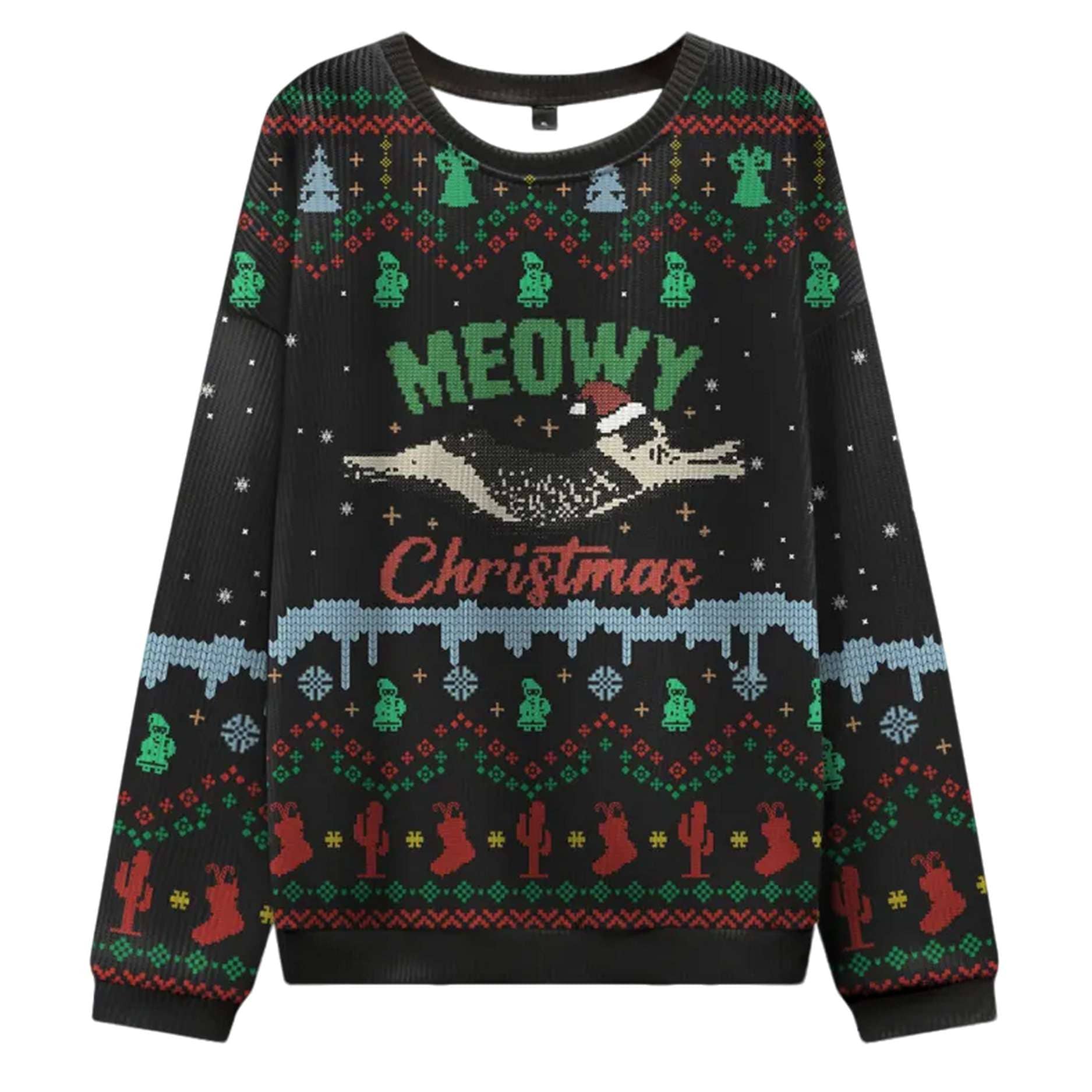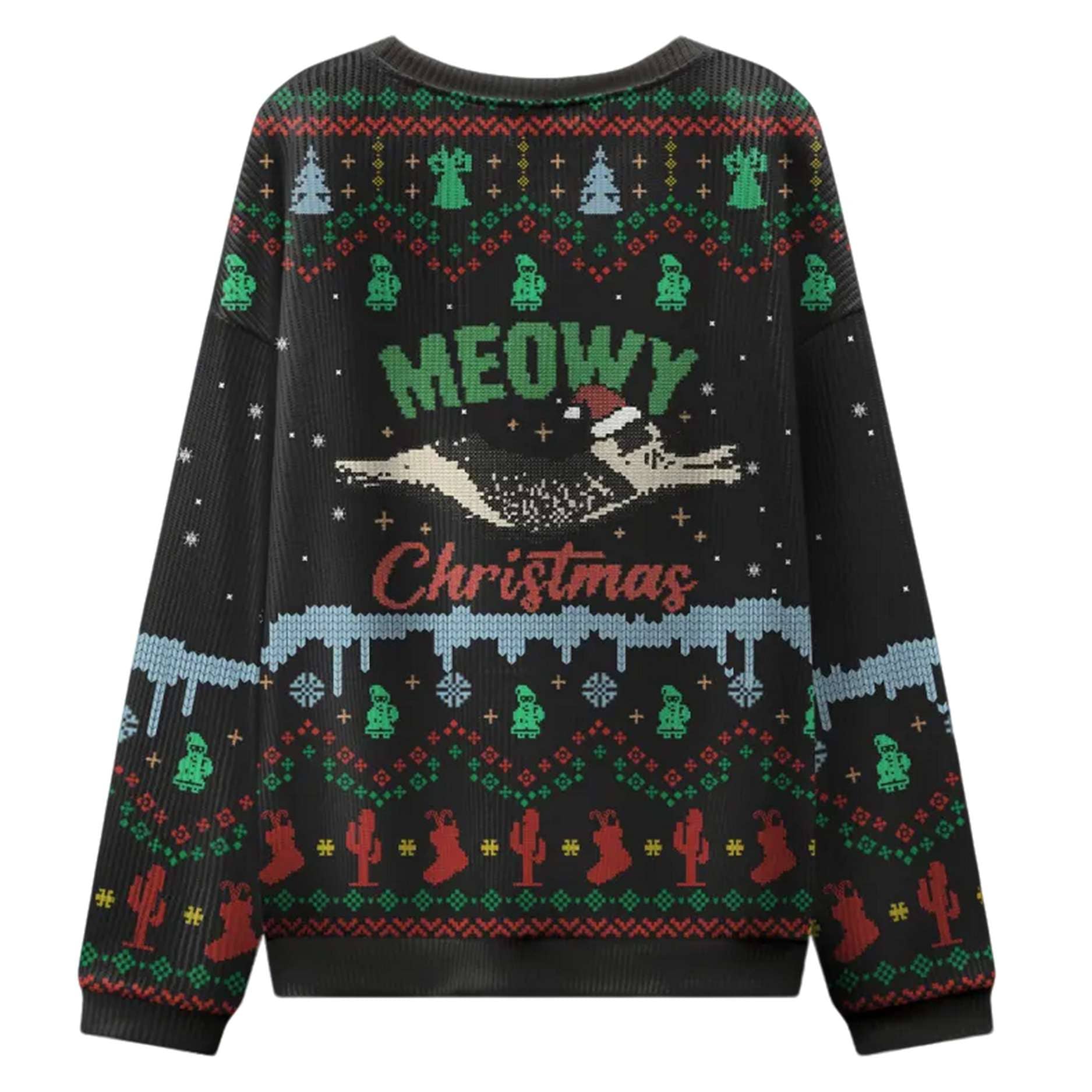 Ready to add some feline fun to your holiday festivities? The Meowy Christmas Adventure Ugly Sweater is here to make your season bright. This unique sweater features a whimsical blend of holiday cheer and cat-themed humor, perfect for any cat lover. The centerpiece of the design is a pixelated cat wearing a Santa hat, floating in the air with the phrase “MEOWY Christmas” above and below it, as if on a magical adventure. The dark background is adorned with festive, light-colored motifs, including Christmas trees, snowmen, and what looks like a mountain landscape, making for a truly unique and playful scene.