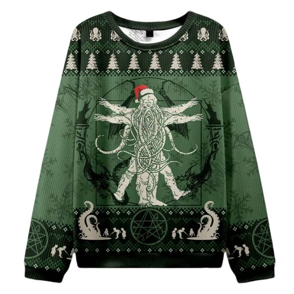 The front of this verdant green sweater features a truly unsettling yet festive depiction of Cthulhu, the Great Old One, in a classic “Vitruvian Man” pose, complete with a jaunty Santa hat. He’s surrounded by arcane symbols and shadowy figures, adding to the mystique.