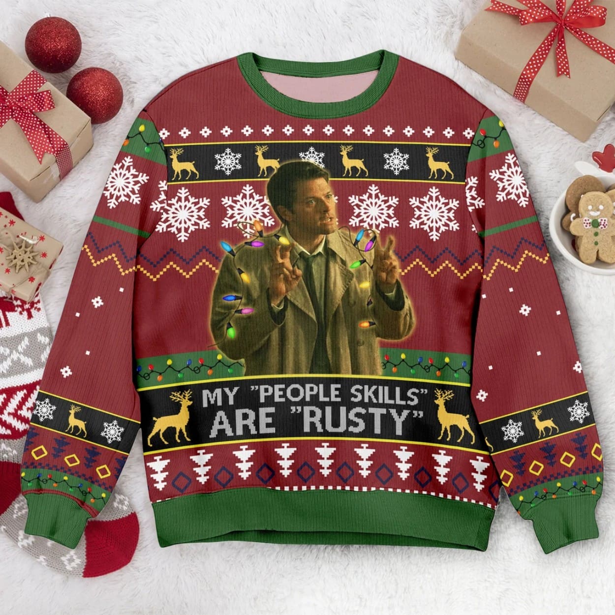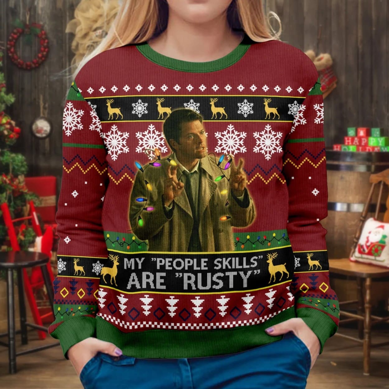 The design is a masterful blend of holiday kitsch and fandom humor. The sweater features a rich Maroon background adorned with festive Nordic-style patterns, including white snowflakes, gold reindeer, and geometric designs. Central to the design is a classic image of Castiel, wrapped in a string of colorful Christmas lights, giving a nervous, slightly confused look. Below his portrait, the iconic, quote is printed in bold white and yellow text: “MY “PEOPLE SKILLS” ARE “RUSTY”—a perfect caption for any angel (or person) trying to navigate a family gathering.