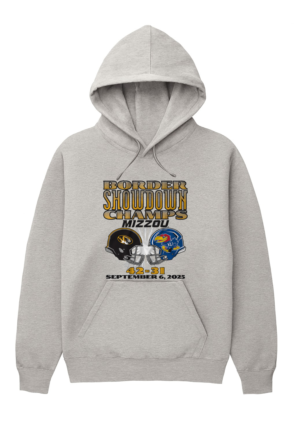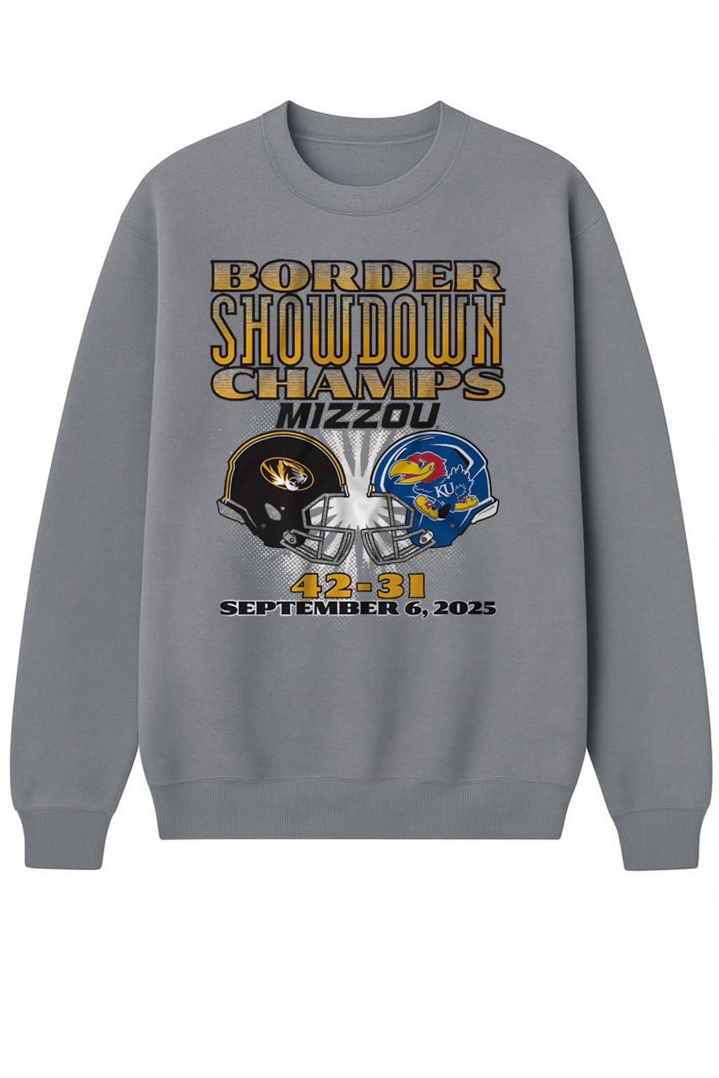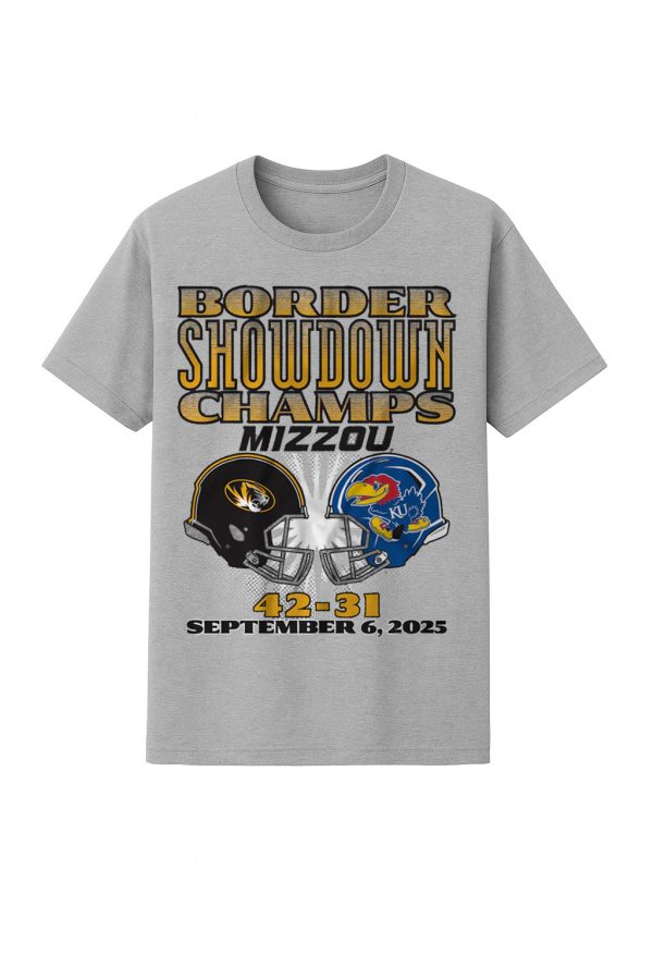 Crafted from soft, breathable polyester, this shirt is designed for comfort and long-lasting wear. The heather gray fabric provides a classic, versatile look. The front of the shirt features bold, eye-catching graphics that capture the essence of the rivalry. At the top, the words “BORDER SHOWDOWN CHAMPS MIZZOU” are printed in a powerful, distressed font with a gold and black outline. Below, two football helmets face each other, representing the clash between the Tigers and the Jayhawks. The final score, “42-31,” and the date of the historic game, “SEPTEMBER 6, 2025,” are proudly displayed below the helmets.