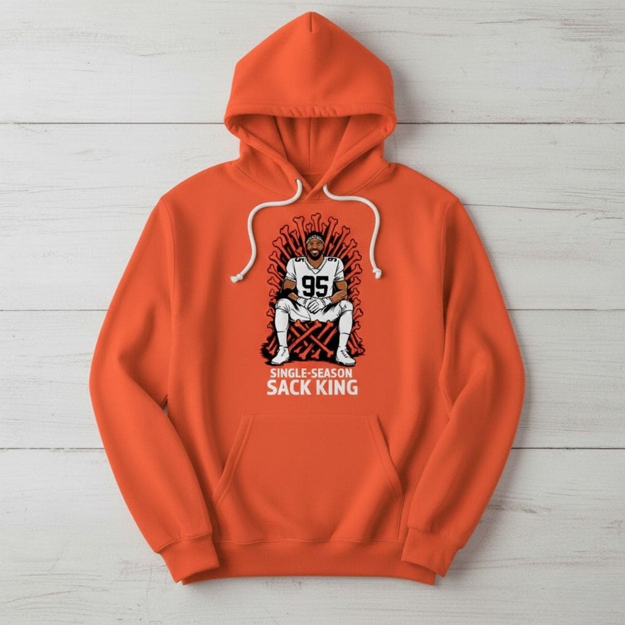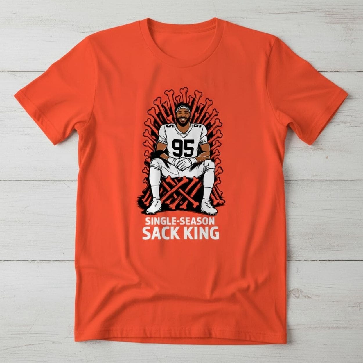 Celebrate a historic defensive milestone with the Myles Garrett Single-Season Sack King Shirt. This vibrant orange tee honors the incredible dominance of Cleveland’s star defensive end, capturing his legendary status as the undisputed king of the sack. Featuring a unique “throne of bones” design, this shirt is a must-have for every member of the Dawg Pound who wants to represent one of the most feared players in football.