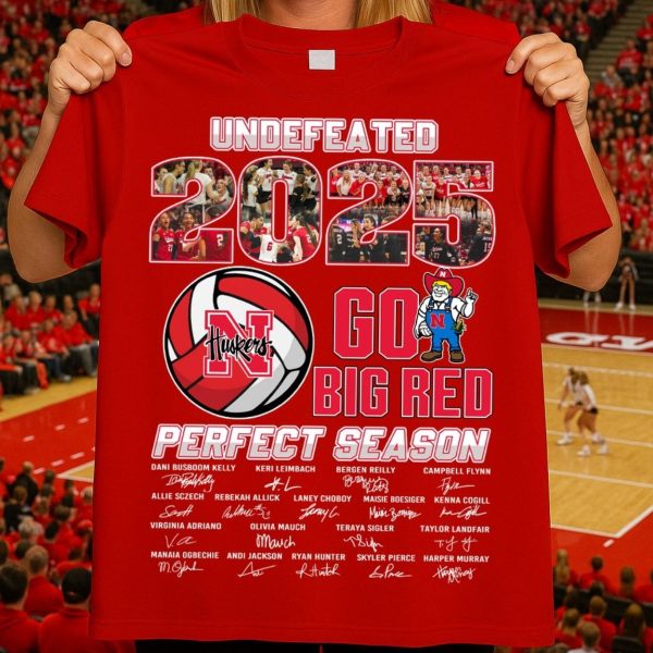 The shirt features massive red graphics centered around the words “UNDEFEATED” and “2025,” with player photos filling the numbers. Below this is a large volleyball graphic with the Huskers ‘N’ logo and the powerful slogan “GO BIG RED” and “PERFECT SEASON”. The design is completed by the reproduced signatures of the entire team roster, forever documenting the players who made history.