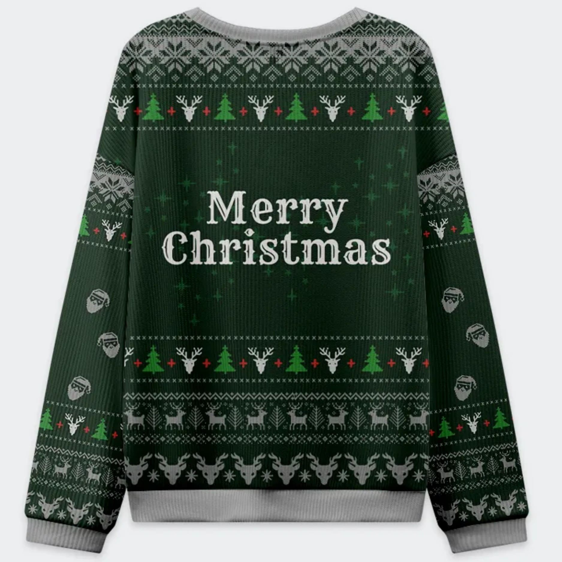This fun and creative design features a checklist with three boxes: “Nice,” “Naughty,” and “Overachiever,” with the last box proudly checked. Next to the checklist, a cartoon Santa is seen holding a large, overflowing wine glass, as if he’s the ultimate overachiever. The classic ugly Christmas sweater pattern is updated with a festive blend of dark green, red, and white, adorned with snowflakes, reindeer, and Christmas trees. Made from soft, durable polyester, this sweater offers comfortable warmth without the itchiness of traditional wool, making it perfect for your next holiday get-together. It’s a guaranteed conversation starter and a great way to show off your fun-loving, overachieving personality at any office party or festive event.