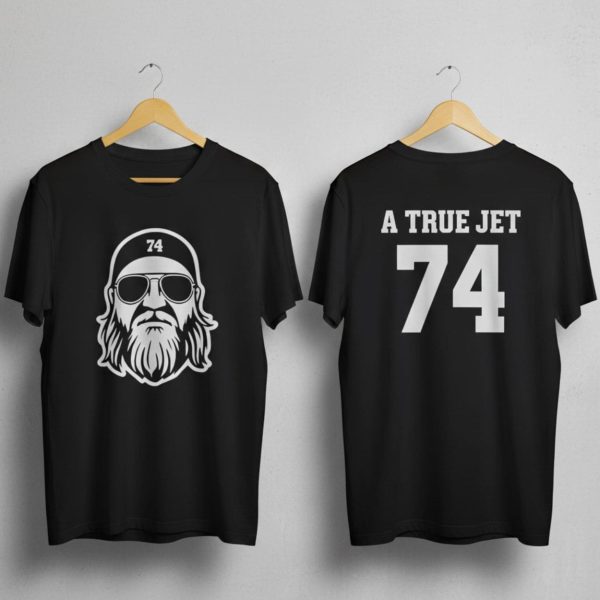 - Back Graphic: The back features bold, white block lettering with the phrase “A TRUE JET” directly above his massive number 74. This simple, powerful design makes an undeniable statement of team loyalty and respect for the legend.