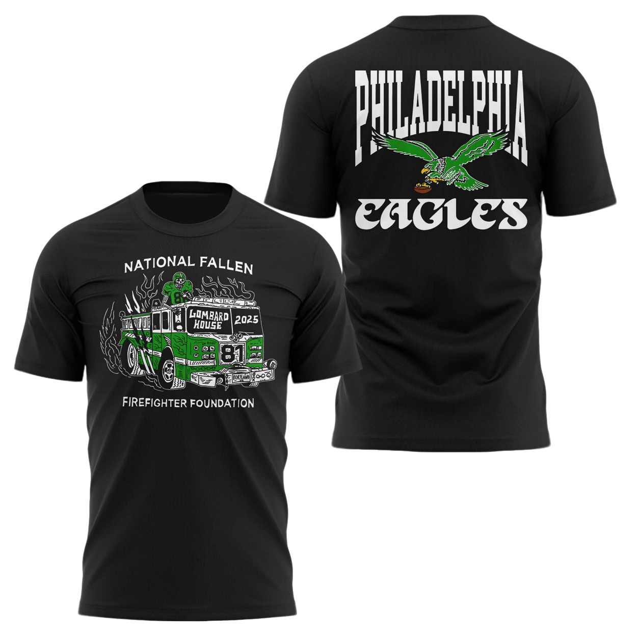 - The ‘Nick Sirianni 2025 National Fallen Firefighters Foundation Eagles Shirt‘ features a bold and meaningful design on a classic black background.