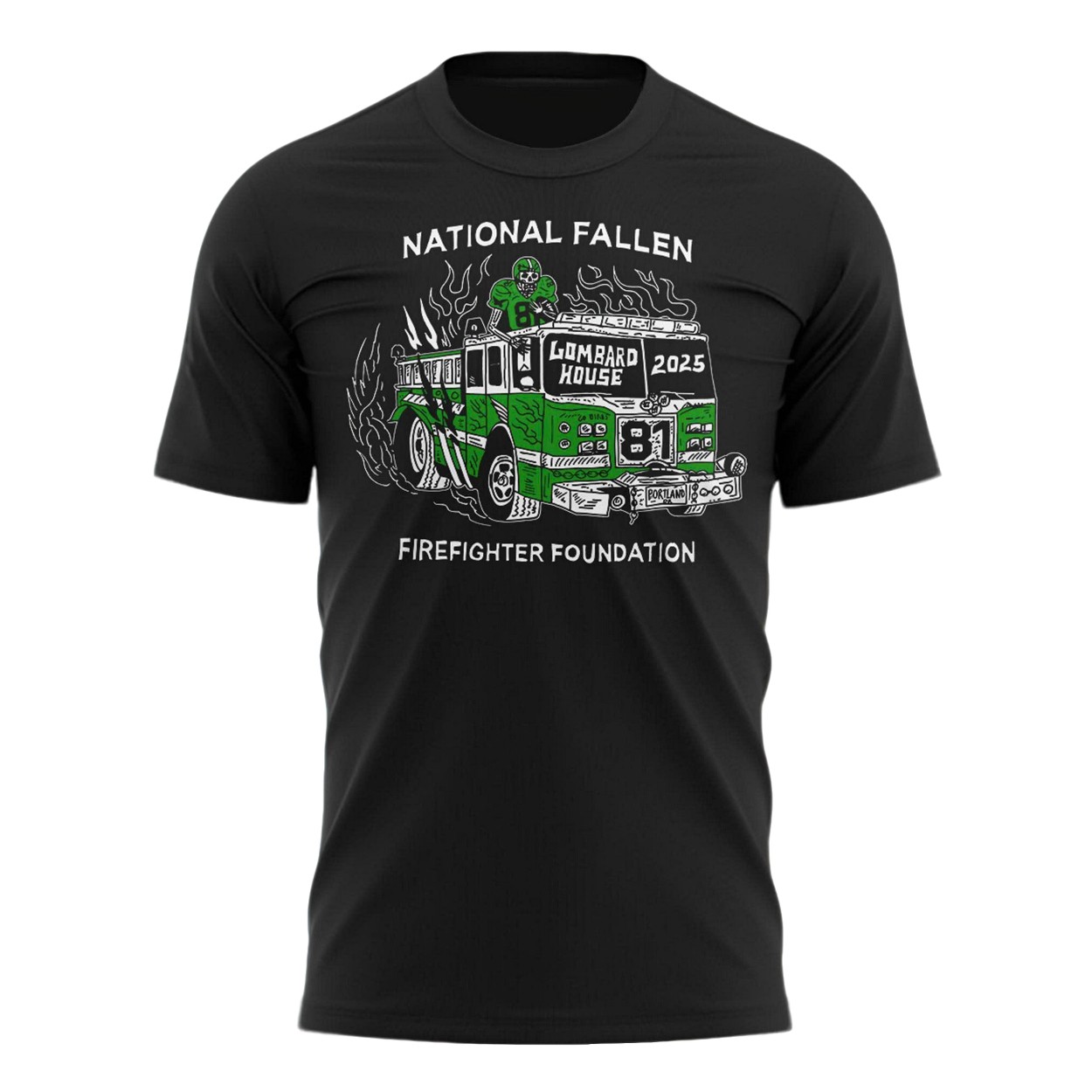 - The front of the shirt displays a striking graphic of a fire truck, with “Lombard House 2025” and the number 31 on its side.