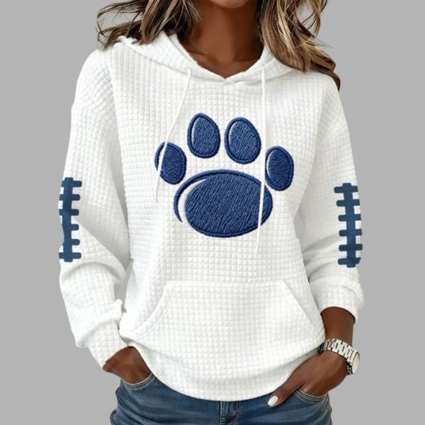 This hoodie proudly displays a bold, printed-style Nittany Lion paw print on the chest, rendered in a rich navy blue that stands out against the crisp white fabric. The sleeves are uniquely accented with deep-blue football graphics. Crafted from a soft, breathable waffle fabric, this pullover provides a comfortable texture and excellent insulation, ensuring warmth without bulk. It features a classic adjustable drawstring hood for personalized comfort and a practical kangaroo pocket, perfect for keeping hands warm or stashing small essentials. Available in a comprehensive size range from S to 6XL, ensuring a perfect fit for every member of the Nittany Nation.