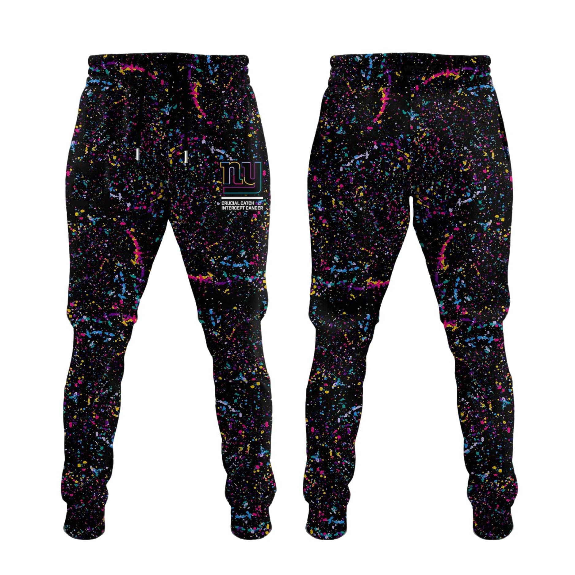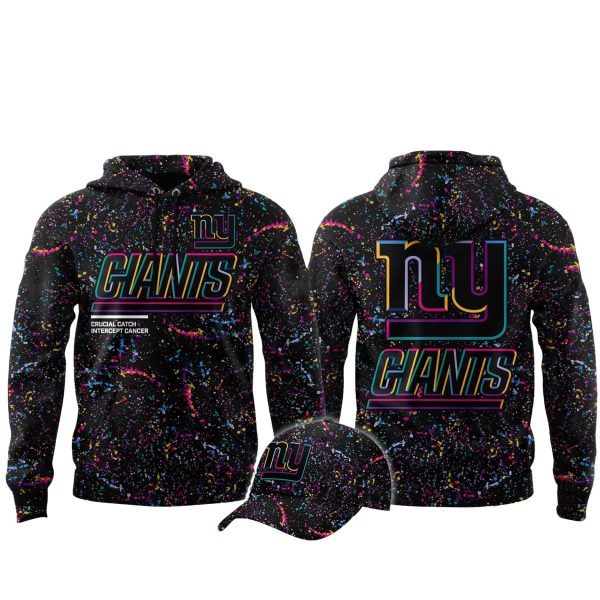 The Front showcases the New York Giants “NY” and “GIANTS” wordmark with a unique rainbow/neon outline, symbolizing the various cancers the initiative supports. Below the logo, the slogan “CRUCIAL CATCH INTERCEPT CANCER” is printed near the hood.