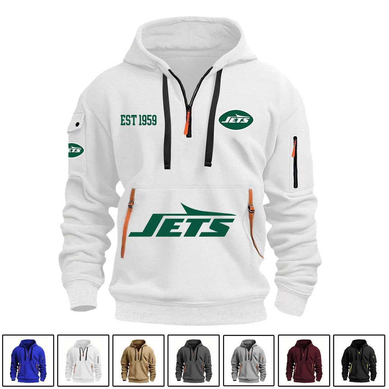 Don’t miss out! Elevate your fan gear. Order your NY Jets EST 1959 Quarter-Zip Hoodie today and cheer on your team in style!