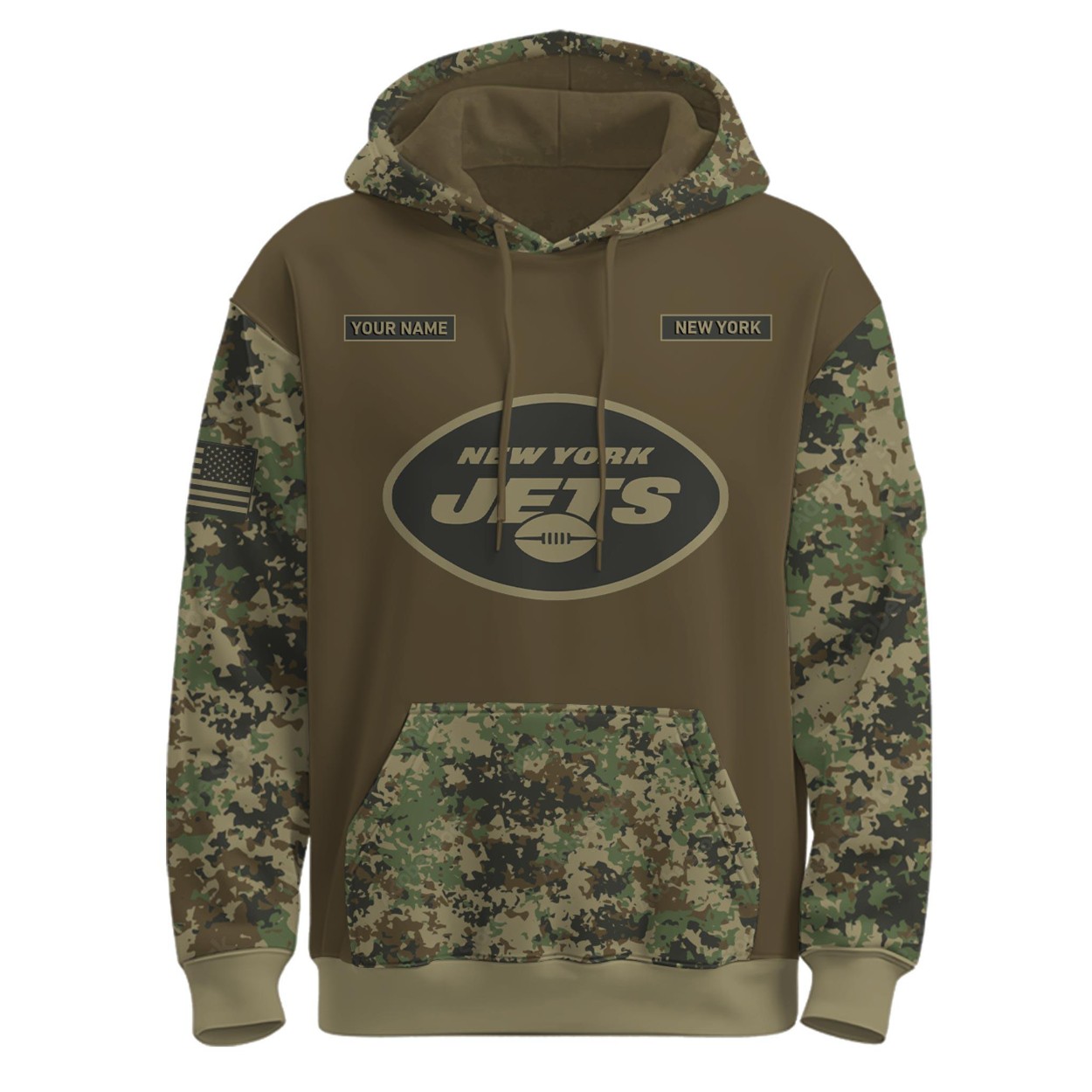 - This unique hoodie features an eye-catching design with a front that boldly displays the iconic NY Jets logo over a rich, olive drab base.