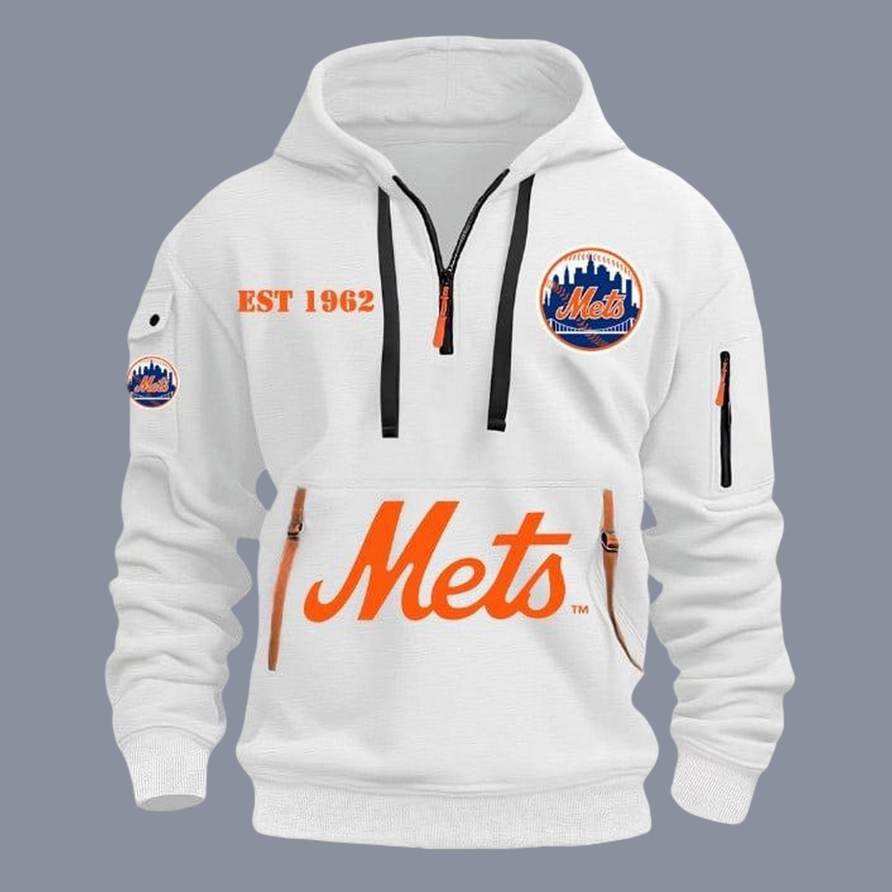This hoodie is designed with both style and functionality in mind. It features a modern quarter-zip front, a bold “Mets” logo on the pouch, and a distinctive “EST 1962” graphic to honor the team’s founding year. It also includes the skyline logo on the chest and an additional pouch on the arm, adding to its unique, premium look.
