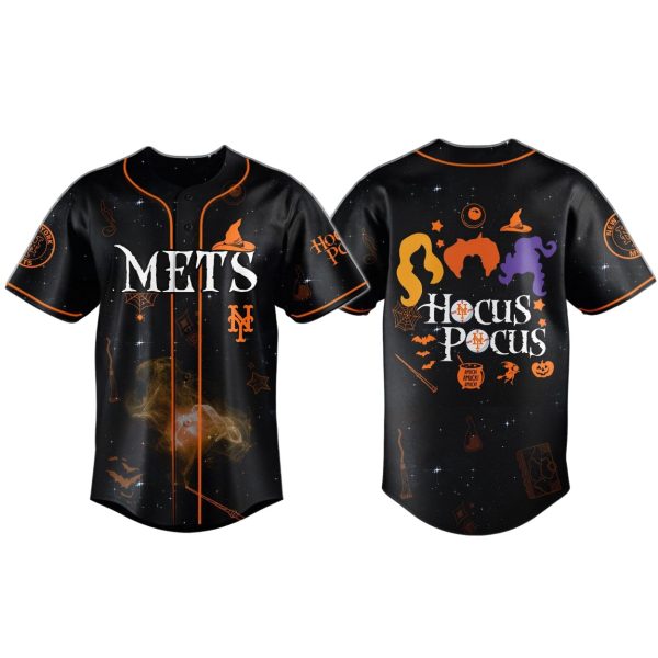 Brew up some spooky season spirit and show off your love for the NYMets with the ‘NY Mets x Hocus Pocus 2025 Jersey‘! We’ve teamed up with the Sanderson sisters to bring you a truly unique piece of fan apparel. This limited-edition jersey features a dark, starry backdrop with a fiery orange trail of magic, complete with iconic Hocus Pocus symbols like a witch’s broom, spell book, and the cauldron. The front proudly displays “METS” in a whimsical, stylized font with the classic Mets logo. The back showcases the unforgettable silhouettes of the three Sanderson sisters’ hairstyles along with the “Hocus Pocus” title, and a variety of Halloween-themed details, including bats, spiders, and pumpkins.