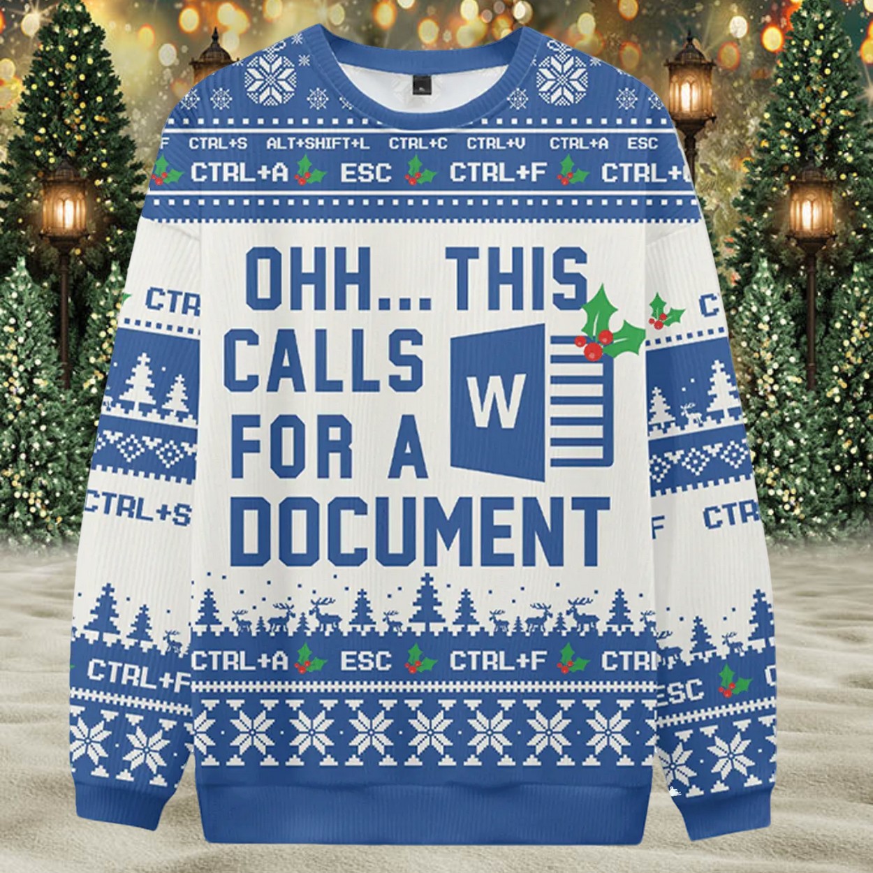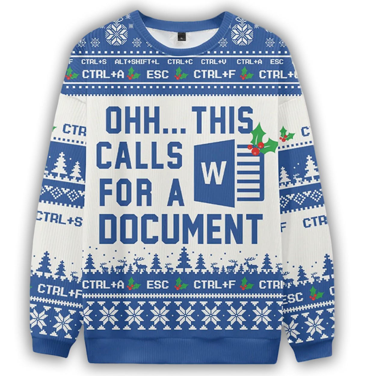 The sweater features a prominent, holly-adorned Word logo, taking center stage. Surrounding it, and bordering the top and bottom, you’ll find a playful array of essential keyboard shortcuts like CTRL+S, CTRL+A, and ESC, reminding everyone of your document mastery. The sleeves and lower band are decorated with charming winter scenes, including snow-covered Christmas trees, leaping reindeer, and delicate snowflakes, all set against a cheerful blue and white backdrop.