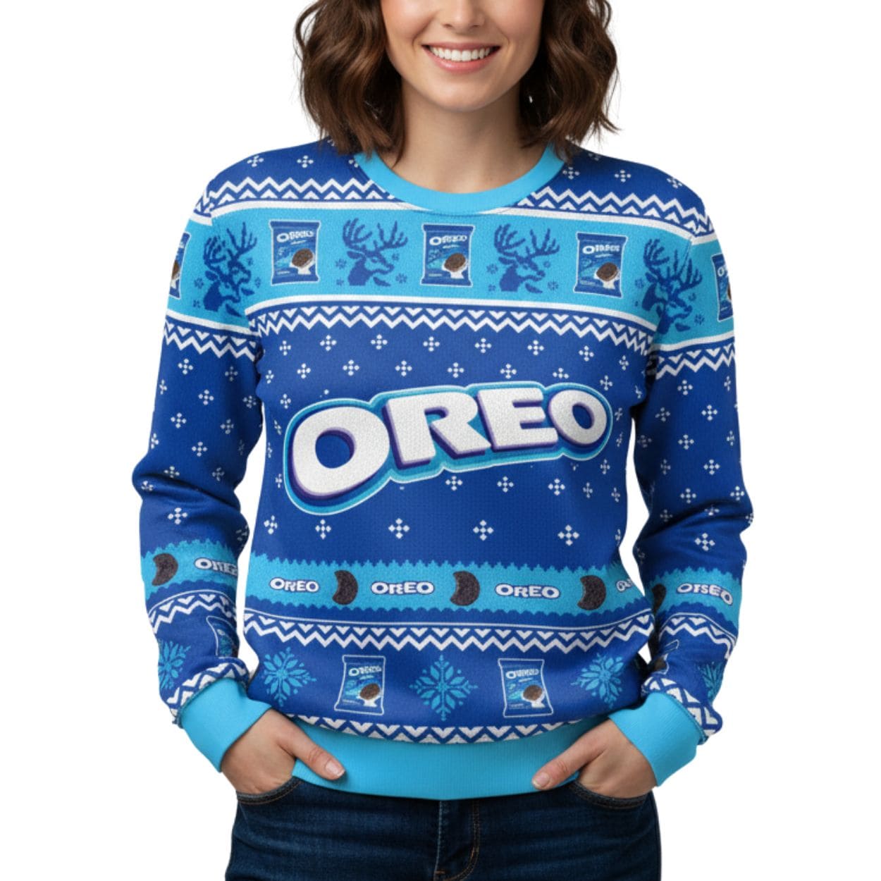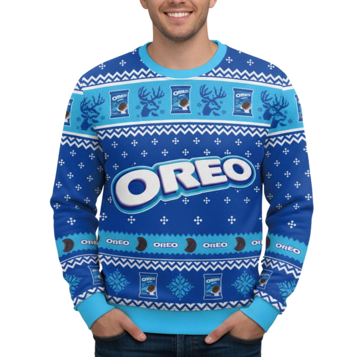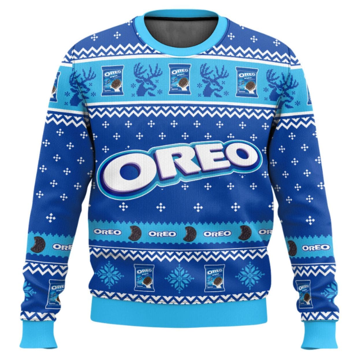 Iconic Motifs: The design features traditional Christmas elements like reindeer silhouettes and snowflakes, cleverly mixed with repeating graphics of Oreo cookies and Oreo cookie packages, creating a humorous and delicious-looking motif.
