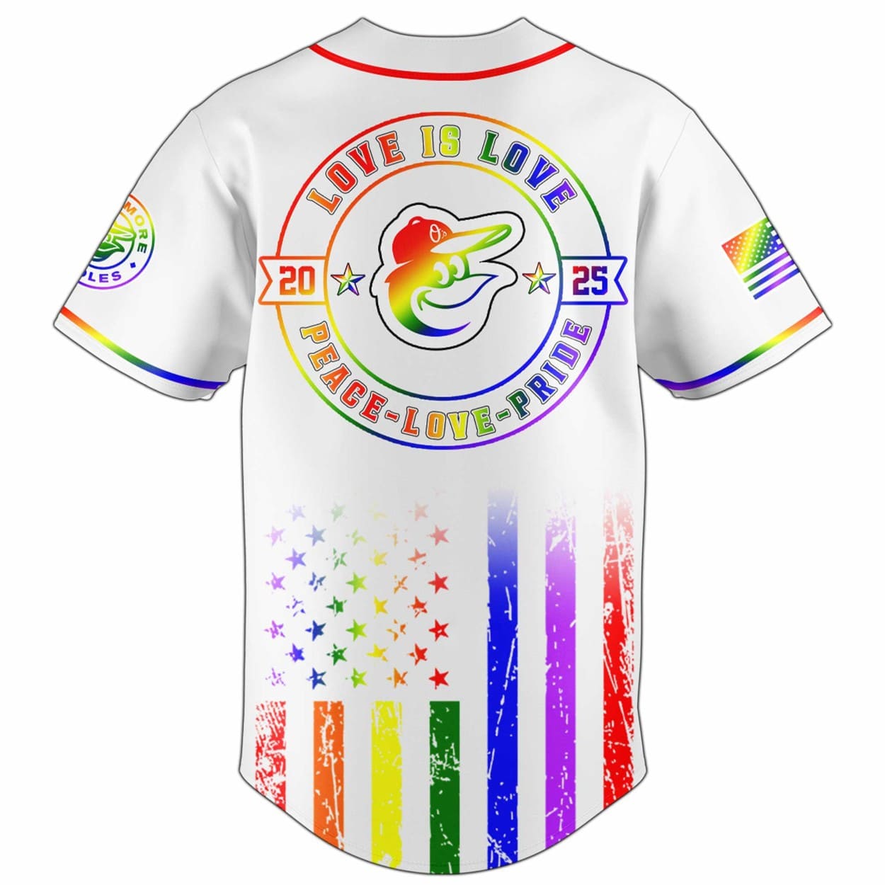 - Design Details: The front prominently displays the Orioles logo, seamlessly integrated with a rainbow gradient background, symbolizing Pride Month. The colors transition smoothly across the jersey, creating a striking visual effect. The back features “PEACE-LOVE-PRIDE” in bold lettering, accompanied by a large number 25, marking the year. The rainbow theme continues, reinforcing the message of inclusivity. The bottom part of the jersey showcases rainbow-colored stripes and stars, resembling elements of the American flag, adding a patriotic touch to the Pride celebration. The right sleeve includes a rainbow-colored American flag, further emphasizing the theme of diversity and inclusion.