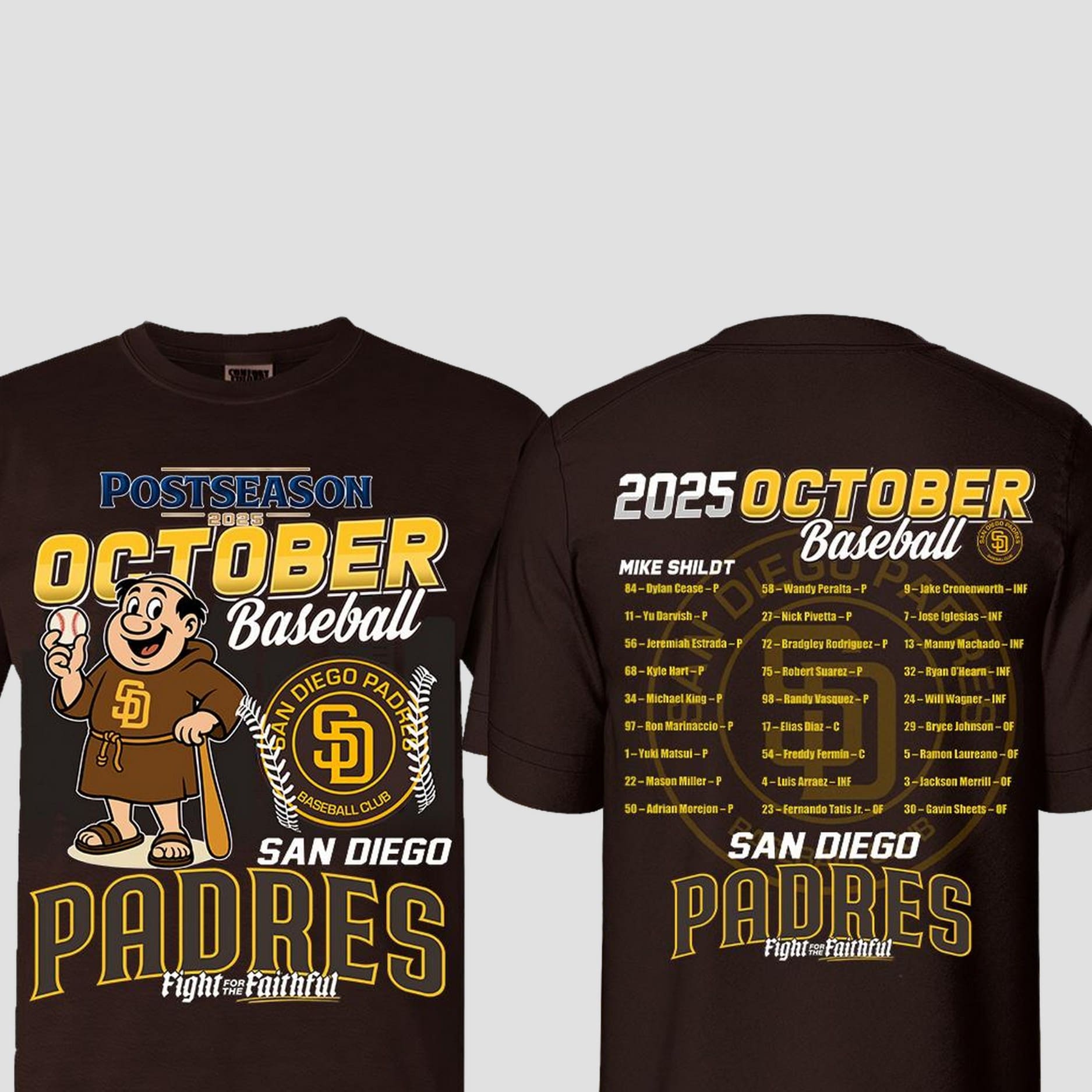 The back of the shirt is a true collector’s item, dedicated to the 2025 roster. It prominently displays “2025 OCTOBER BASEBALL” along with a comprehensive list of the team roster, including the manager, MIKE SHILDT, and key players. This detailed list grounds the shirt in the excitement of this specific season. Made from soft, lightweight polyester, the shirt offers excellent breathability and a comfortable, relaxed fit, ensuring you can cheer the Padres on through every intense inning.