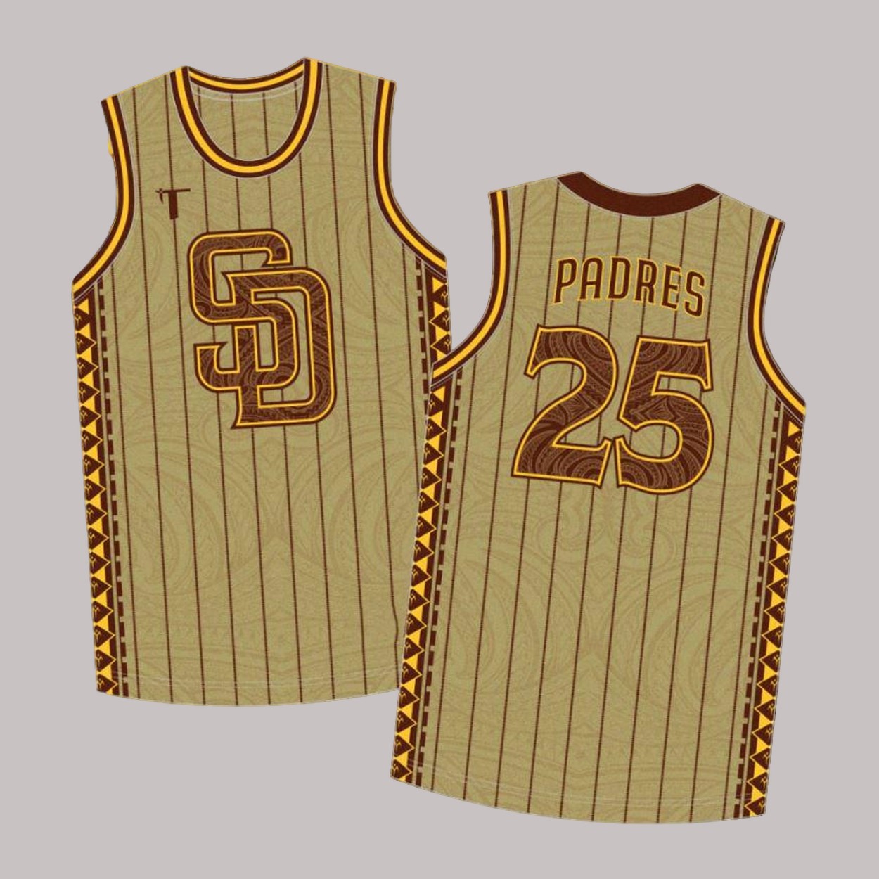 Celebrate the rich Pacific Islander heritage with the Padres 2025 Pacific Islander Heritage Celebration Jersey Giveaway, a stunning tribute to cultural diversity and SD Padres pride. Crafted from lightweight polyester, this jersey is available in sizes S to 5XL, ensuring a comfortable fit for all fans. The design features a unique beige base with vertical stripes, intricate tribal patterns along the sides, and bold “SD” and “25” logos in brown and gold. The back proudly displays “Padres” with the number 25, reflecting the team’s spirit and the 2025 celebration.