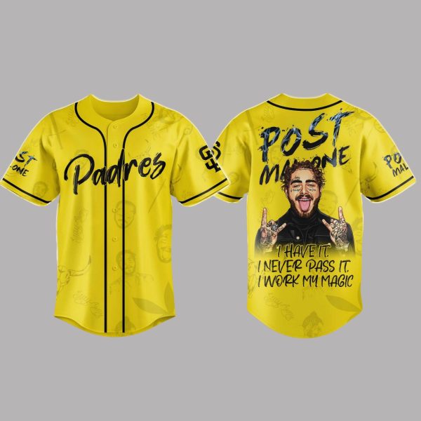- This electrifying yellow jersey fuses the San Diego Padres’ spirit with Post Malone’s bold persona, featuring his iconic tattoos, the phrase “I have it, I never pass it, I work my magic,” and intricate all-over graphics.