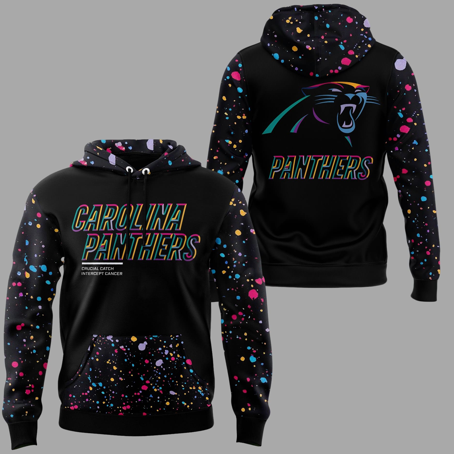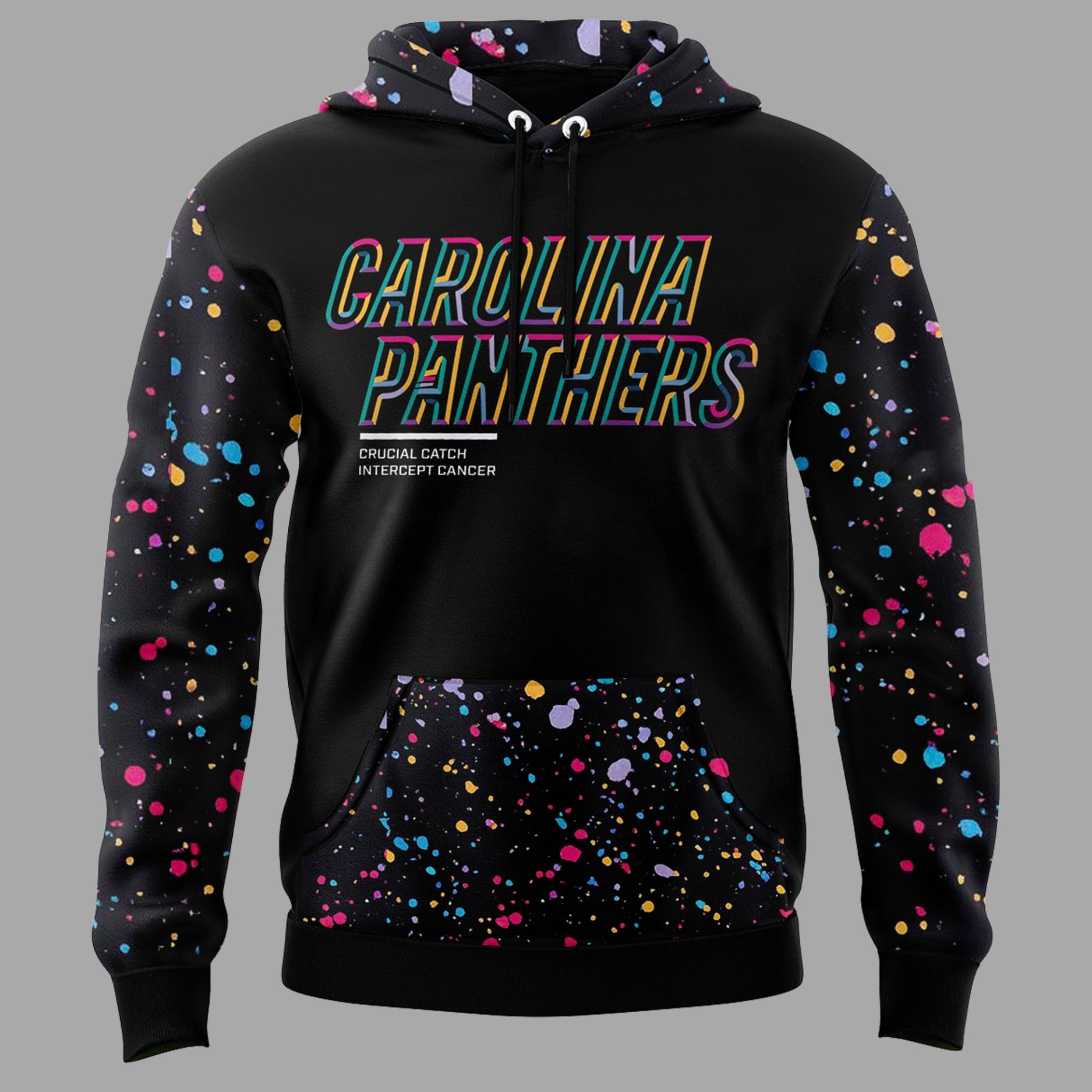 The Front proudly displays “CAROLINA PANTHERS” in a bold, stacked font with a unique rainbow/neon outline, symbolizing the various cancers the initiative supports. Below the main graphic, the slogan “CRUCIAL CATCH INTERCEPT CANCER” is printed near the pocket.