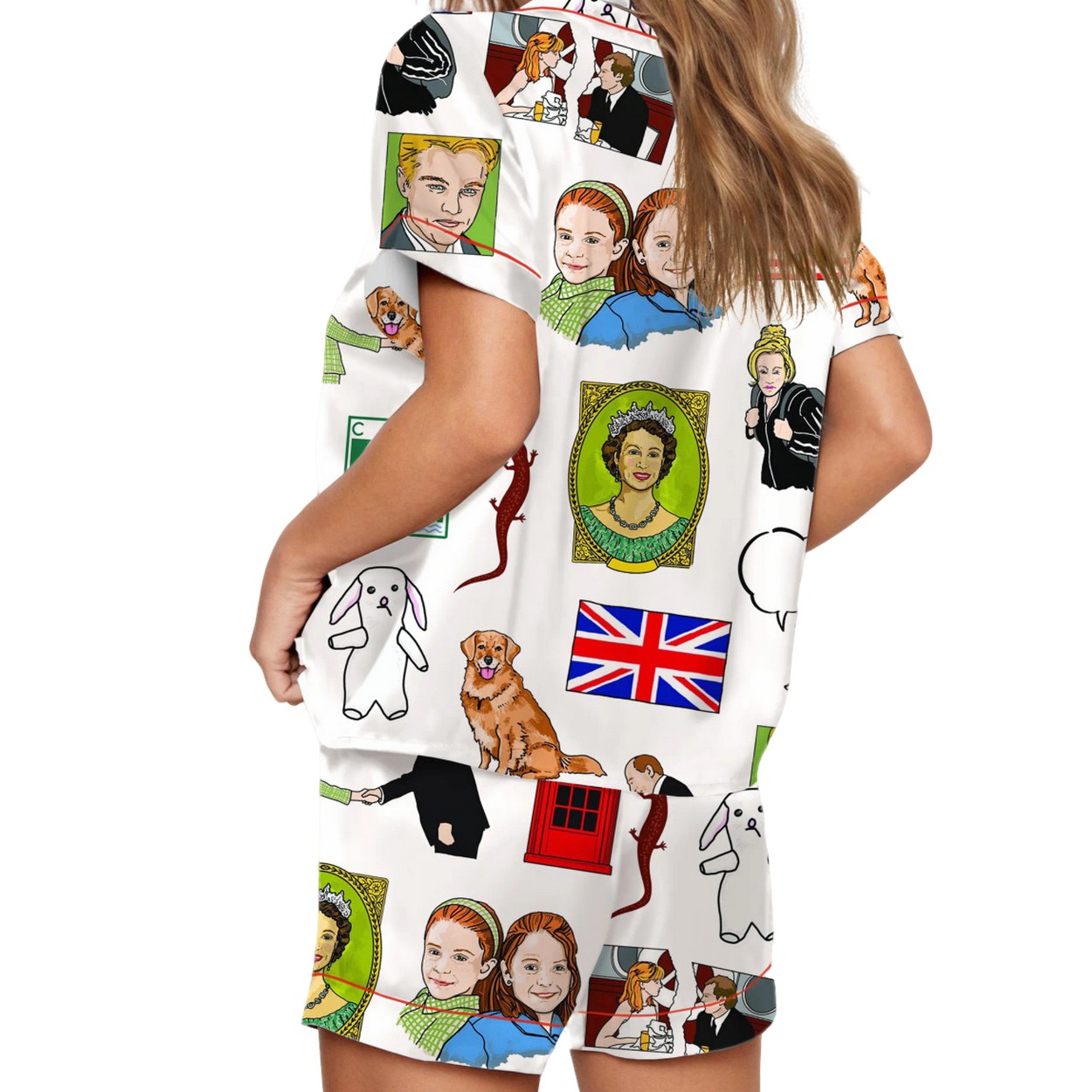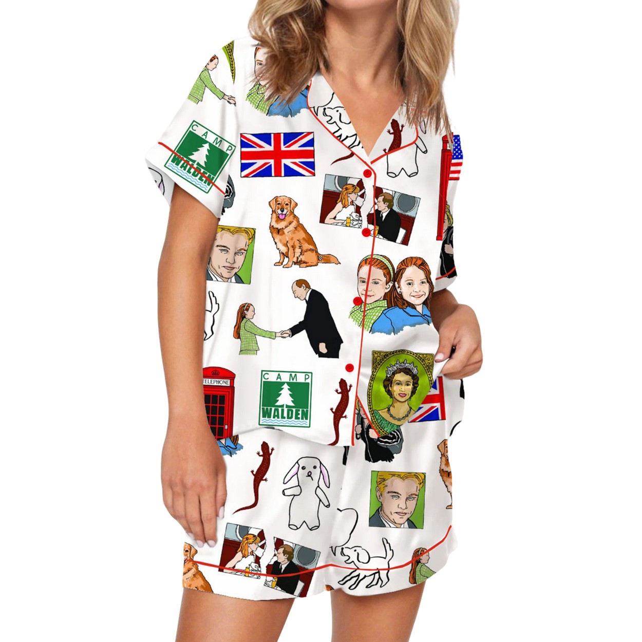 Crafted from a luxurious blend of polyester and spandex, this pajama set offers a silky-smooth, soft feel against your skin. The set features a delightful, all-over print of iconic imagery from the film. Look for illustrations of a young Annie and Hallie, the loyal dog Sammy, the Queen of England, a red London telephone booth, the “Camp Walden” sign, and of course, the US and UK flags.