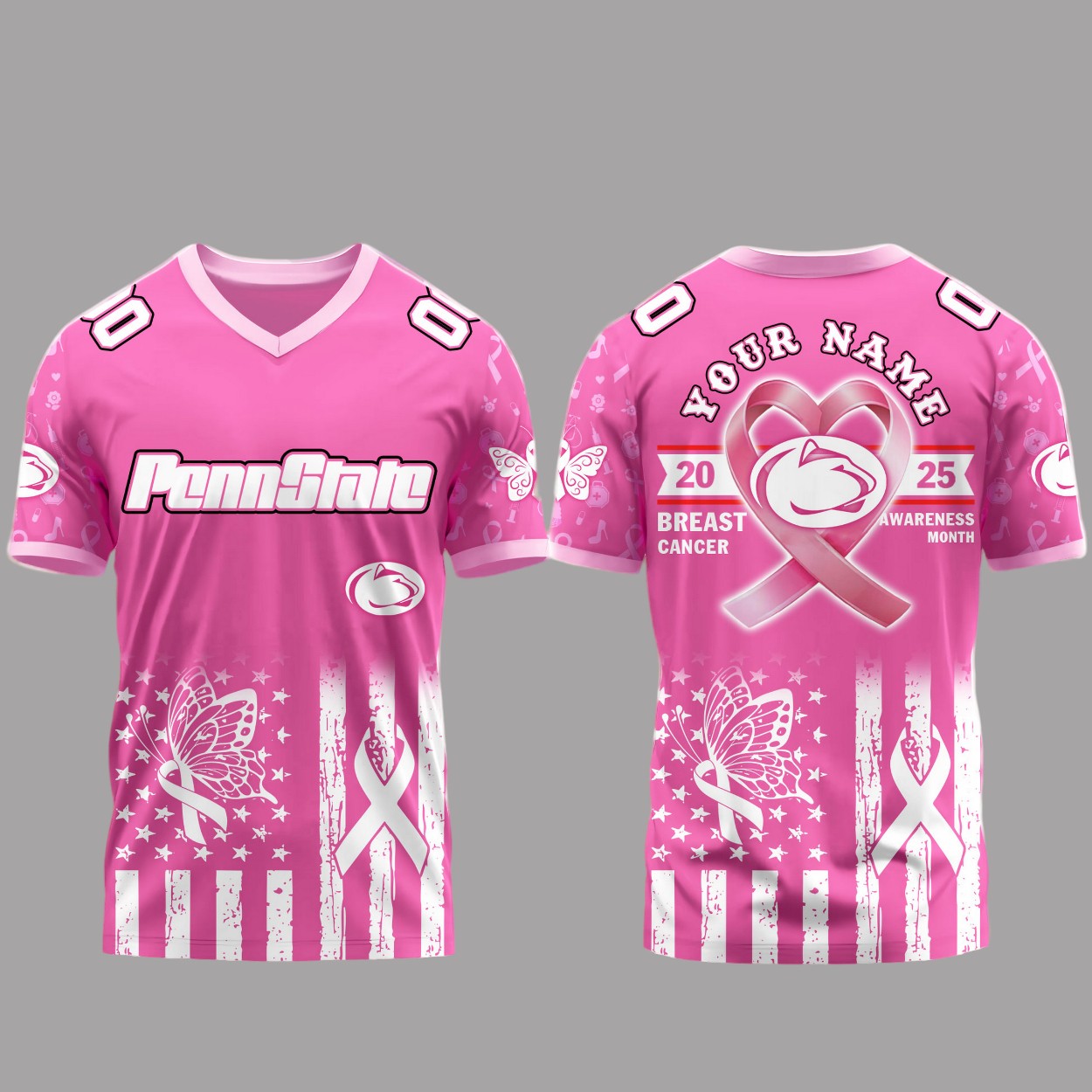 - The front showcases a butterfly and ribbon motif, while the back highlights “20 BREAST CANCER AWARENESS MONTH 25” with a heart-shaped lion logo, symbolizing hope and unity.