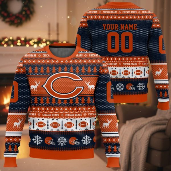 | Design Feature | Full-coverage “ugly sweater” print in Bears colors, with team logos/motifs on the front, and customizable name/number on the back. |