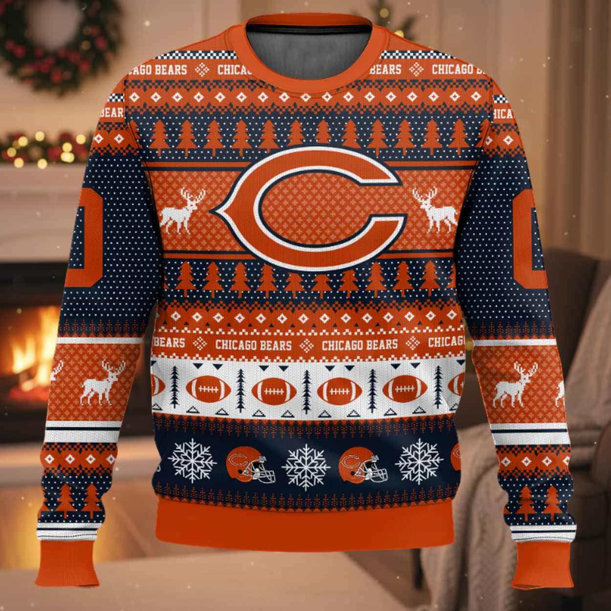 - Front & Center: The classic Bears “C” logo is prominently displayed, framed by festive reindeer, evergreen trees, and snowflakes in a traditional knit pattern. Footballs and helmets are integrated into the borders, cementing the gridiron theme.
