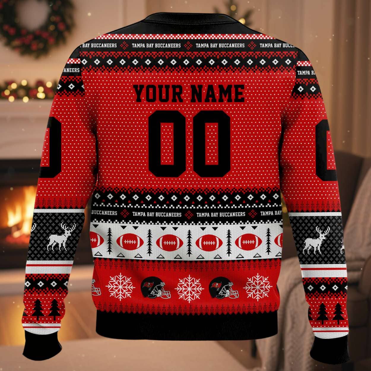 - The Front: The legendary Buccaneers Skull and Crossed Swords Flag flies prominently at the center, artfully surrounded by stylized reindeer and rows of evergreen trees in a traditional pattern. The borders feature repeating motifs of footballs and helmets, unequivocally affirming the gridiron theme.