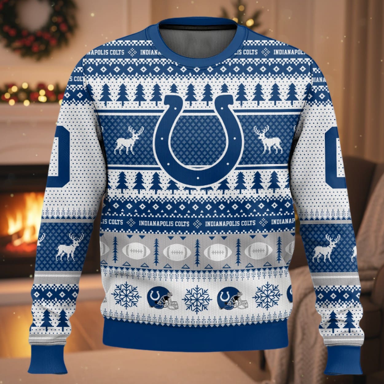 - Front & Center: The Colts Horseshoe logo is boldly showcased, surrounded by festive reindeer, evergreen trees, and snowflakes in a traditional pattern. Horizontal bands feature repeating motifs of footballs and helmets, cementing the gridiron theme.