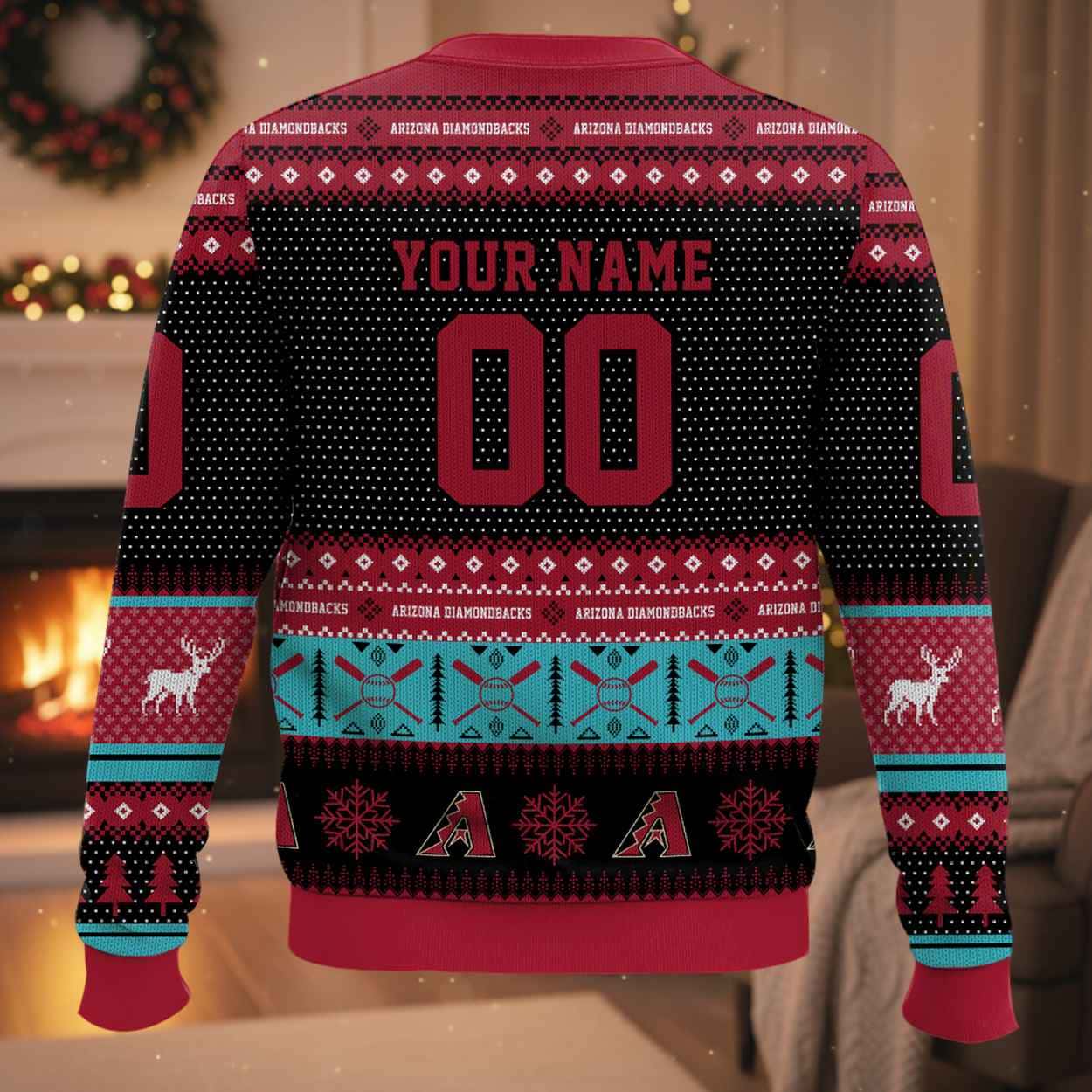 - The Emblem (Front): The massive Diamondbacks “A” Logo holds prime position, artfully surrounded by festive reindeer, evergreen trees, and traditional patterns. Horizontal bands feature repeating motifs of crossed bats, baseballs, and the “A” logo.