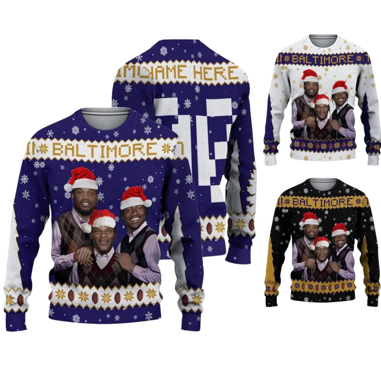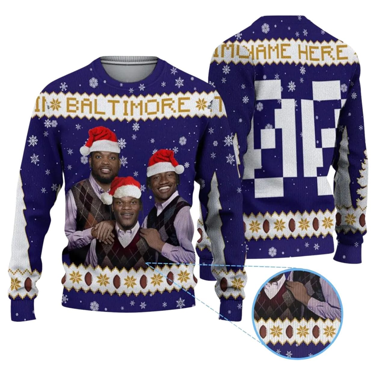 Flock Holiday Blitz: Personalized Lamar Jackson Derrick Henry Zay Flowers Baltimore Ugly Sweater