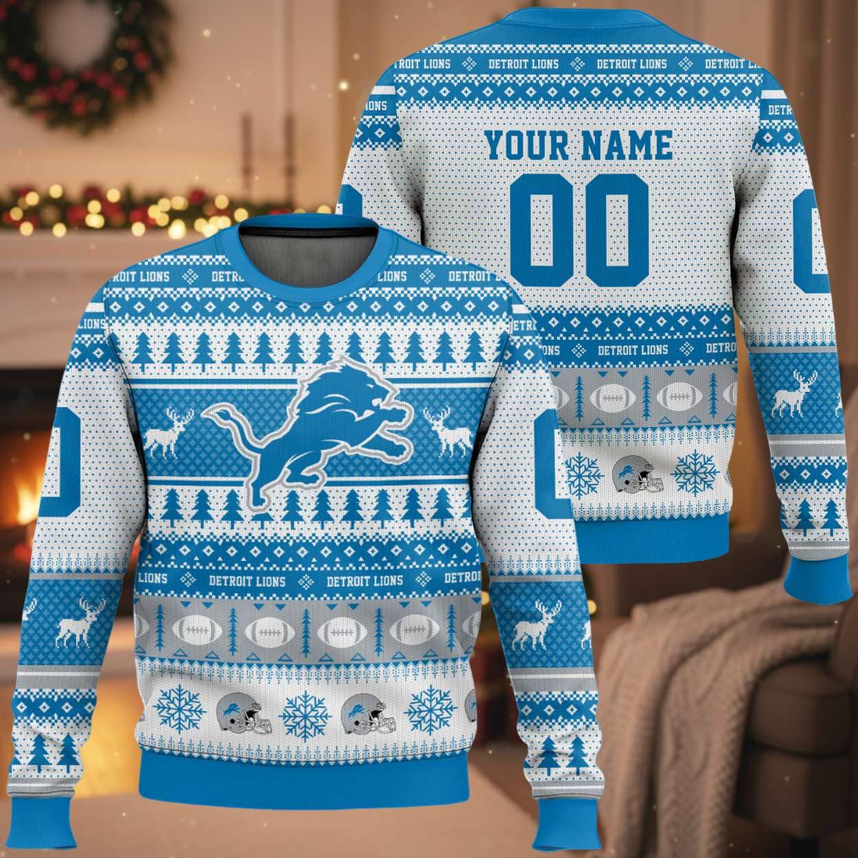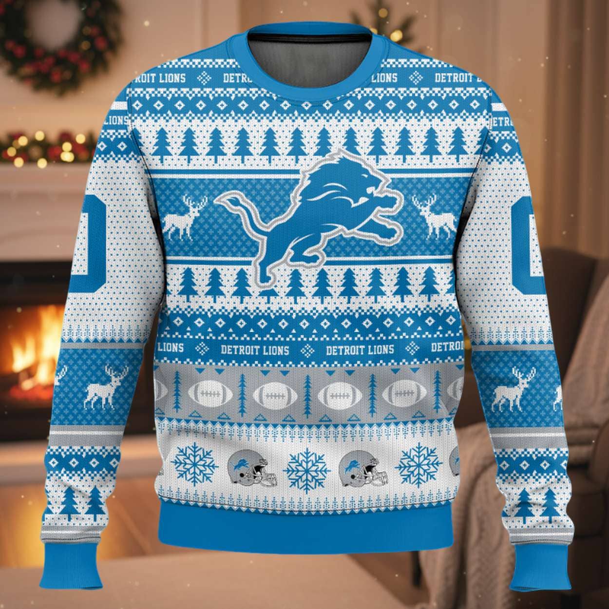 - The Front: The majestic Lions Leaping Logo reigns supreme at the center, flanked by stylized reindeer and rows of evergreen trees. The patterns weave in motifs of footballs and helmets, affirming the sport’s central theme.