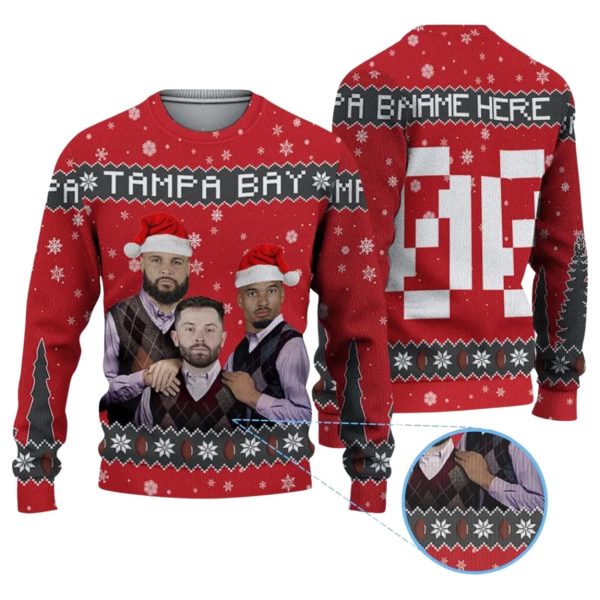 Front: The central panel showcases high-quality, digitally printed images of Mike Evans, Baker Mayfield (front and center), and Emeka Egbuka, all sporting cheerful Santa hats and dapper sweater vests. The text “TAMPA BAY” is printed into a prominent band across the chest.