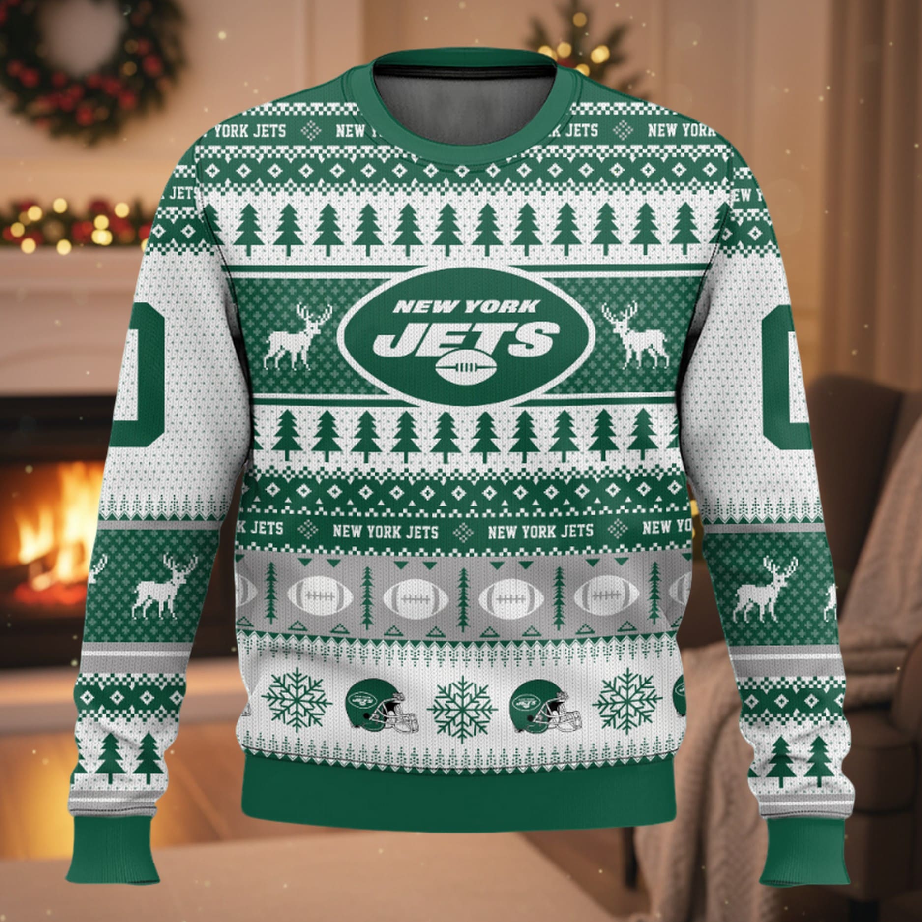 - The classic NY Jets oval logo holds prime position, artfully surrounded by stylized reindeer and evergreen trees in a traditional pattern. The borders feature repeating motifs of footballs and helmets, unequivocally affirming the sport’s central theme.