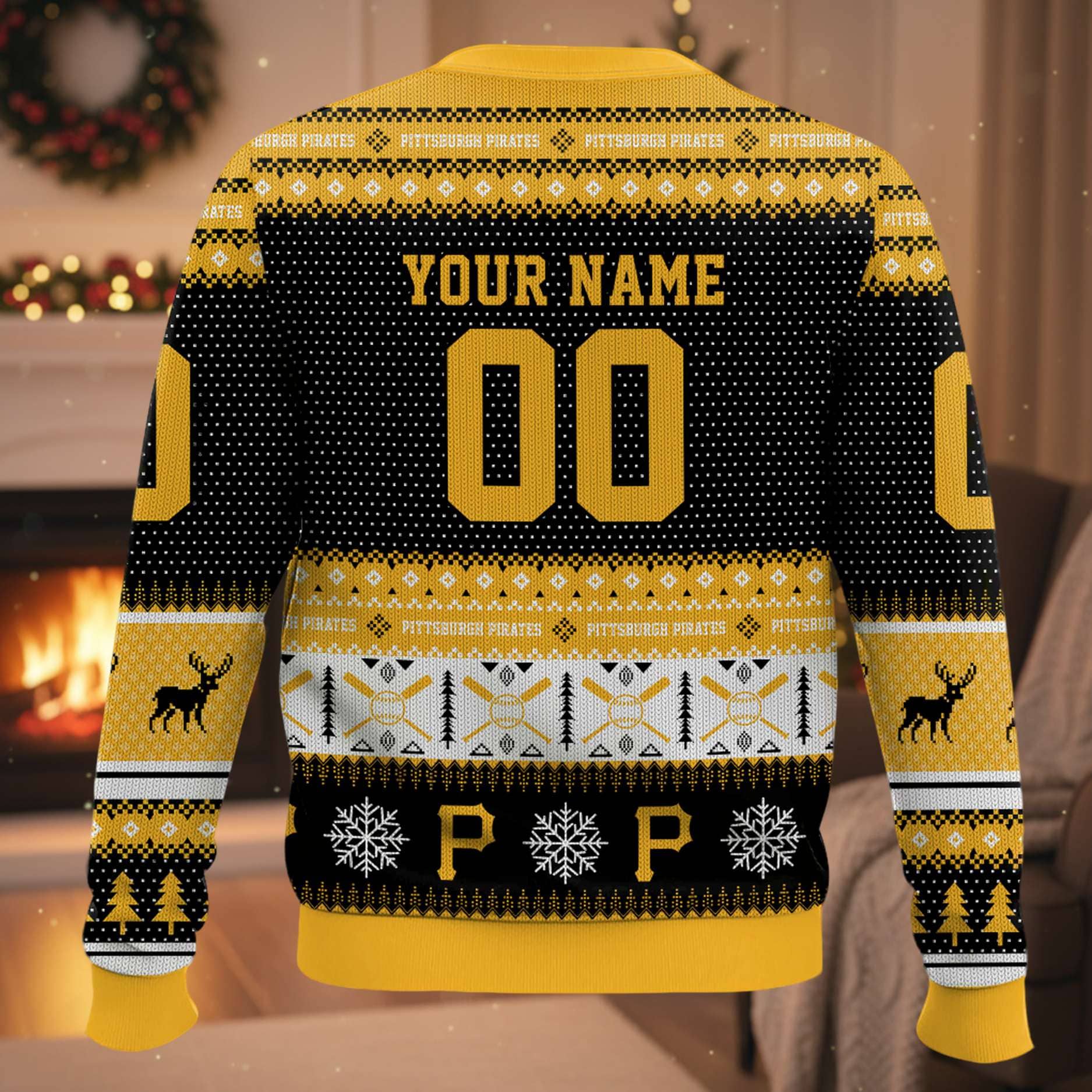 The “ugly sweater” pattern is a cheerful blend of winter themes—including reindeer and Christmas trees—cleverly mixed with baseball motifs like bats and the Pirates logo, creating a unique, spirited look.