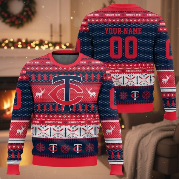 The overall “ugly sweater” pattern is a cheerful tribute, blending traditional winter motifs like reindeer and Christmas trees with unique baseball accents, including bats and the Twins “T” logo. It’s the ultimate cozy uniform for celebrating the season in the upper Midwest!
