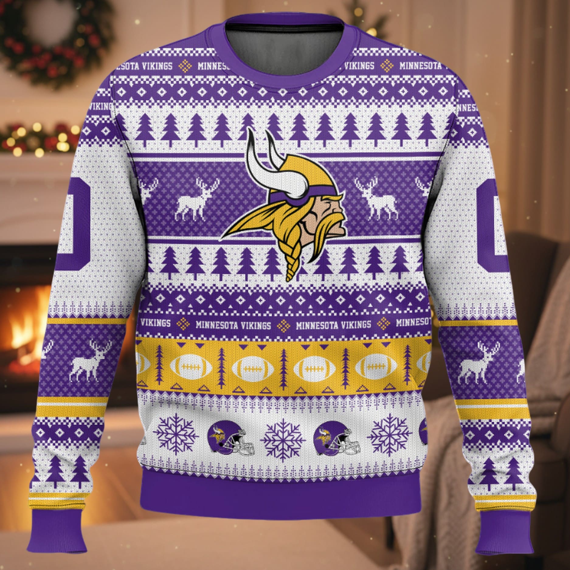 This captivating sweater beautifully marries the bold Vikings brand with classic holiday charm. The legendary Vikings helmet logo stands proudly in the center, set against a vibrant purple, gold, and white backdrop that features a traditional Fair Isle pattern. The design is packed with festive and team-specific details, including evergreen trees, majestic reindeer, and snowflakes, all interspersed with miniature footballs and Vikings helmet graphics. The truly special element is the fully customizable back, allowing you to proudly feature YOUR NAME above a prominent 00 (or your chosen number), creating a unique, personal statement of fandom.