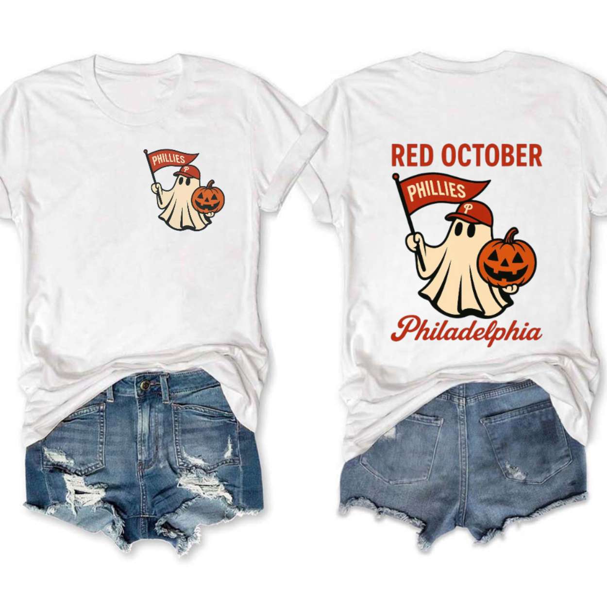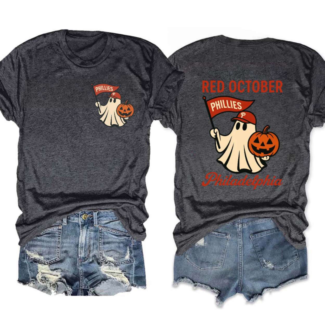 - Back: The rear graphic goes big, boldly declaring “RED OCTOBER” across the top. A larger version of the Phillies ghost and pumpkin motif is centered, with the text “Philadelphia” curved stylishly beneath, making an unmistakable declaration of team and city pride.