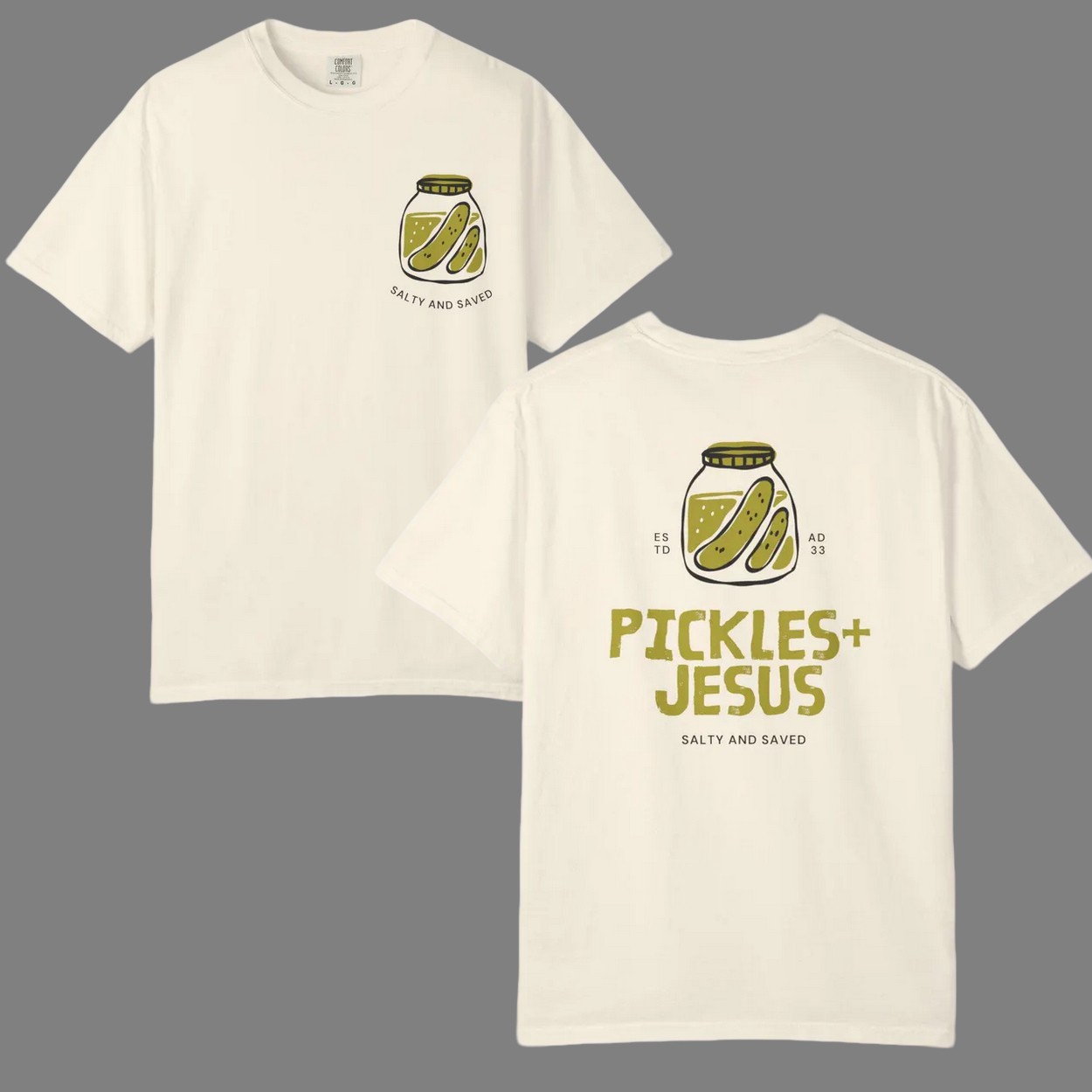 Discover the unique Pickles Jesus Salty And Saved ESTD AD 33 Shirt, a perfect blend of faith and fun! Available in sizes S to 5XL, this shirt is crafted from a comfortable cotton-polyester blend, offering durability and a soft feel. The front features a playful pickle jar design with “Salty And Saved,” while the back boldly displays “Pickles + Jesus” alongside “ESTD AD 33” and a matching jar, symbolizing a timeless message.