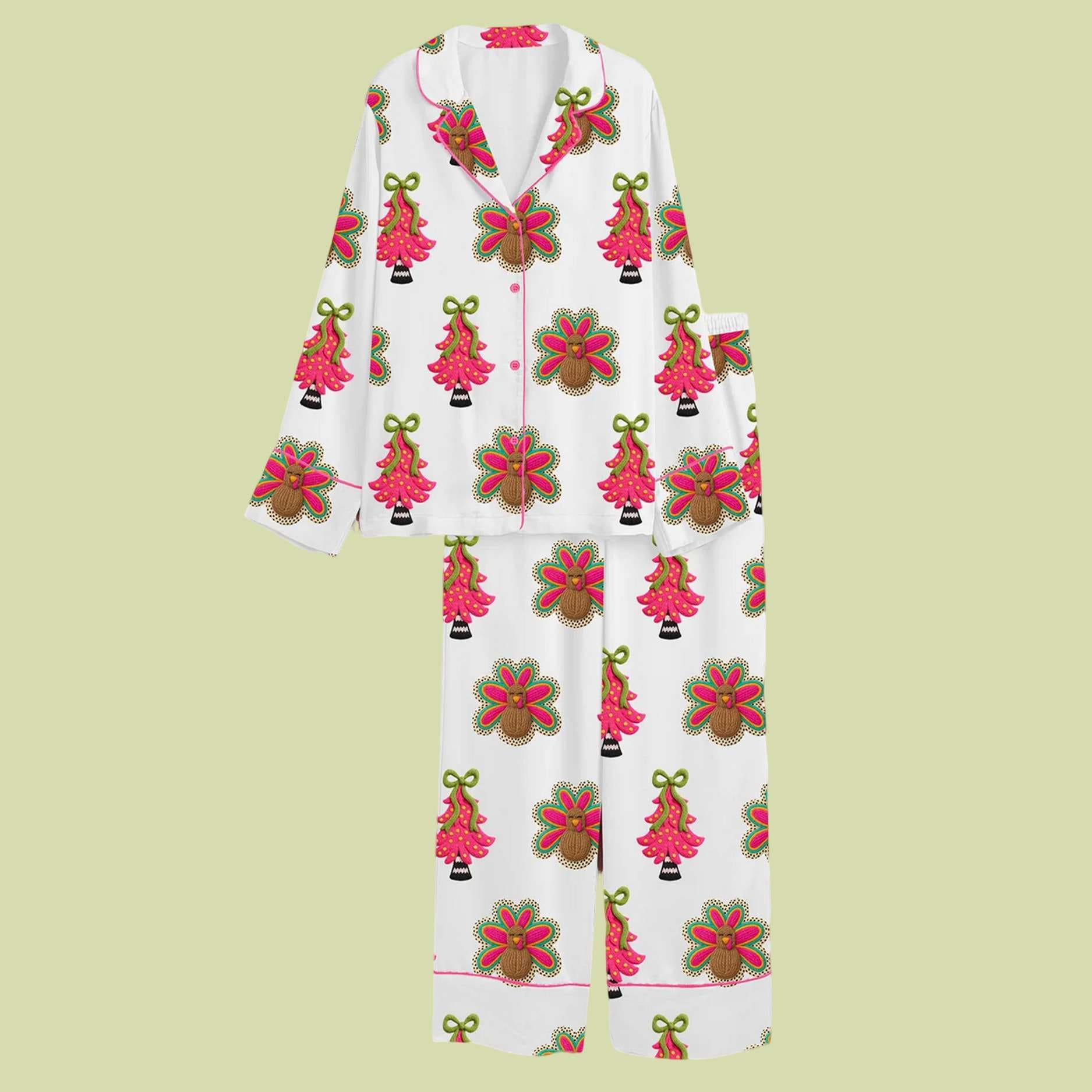 This set features a one-of-a-kind print that combines two major holidays. The all-over pattern showcases whimsical, stylized illustrations of hot pink Christmas trees adorned with green bows, alternating with humorous Thanksgiving turkeys whose tail feathers are replaced by bright pink and green festive patterns.