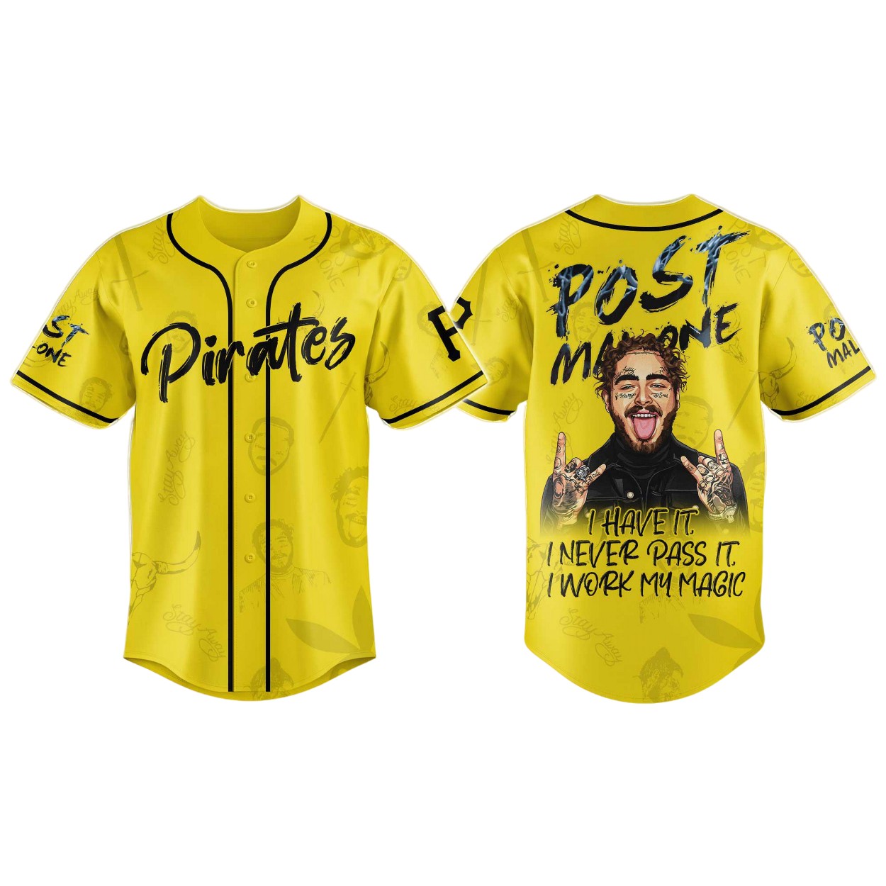 - The front features a bold “Pirates” script in black, paired with intricate Post Malone artwork scattered across the fabric.
