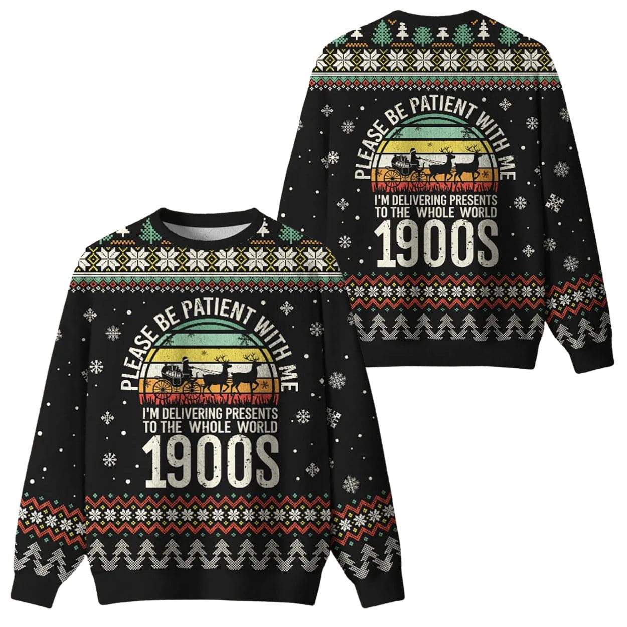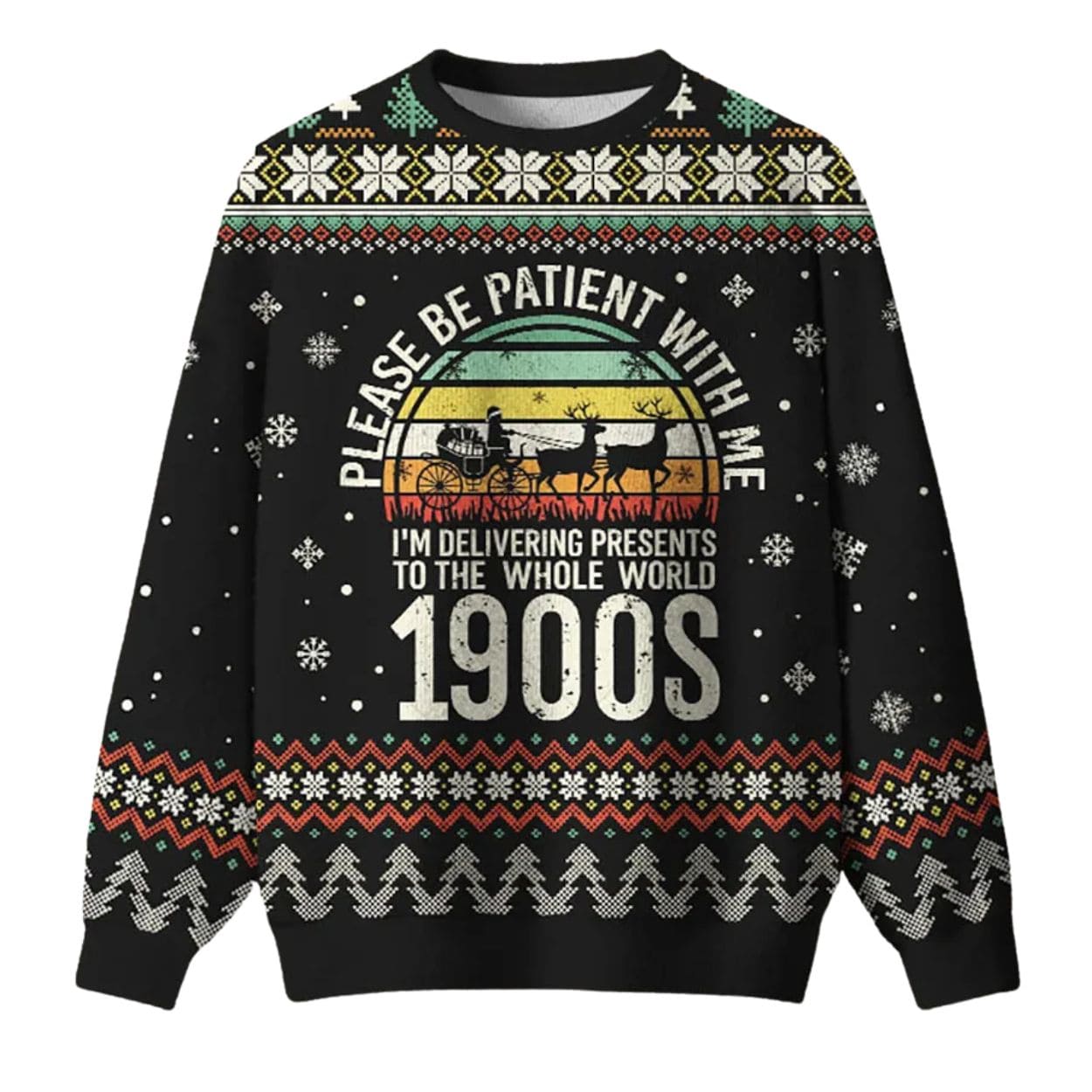 | Design Feature | Full-coverage “ugly sweater” print featuring a vintage Santa sleigh graphic and the slogan: “PLEASE BE PATIENT WITH ME / I’M DELIVERING PRESENTS TO THE WHOLE WORLD / 1900S.” |