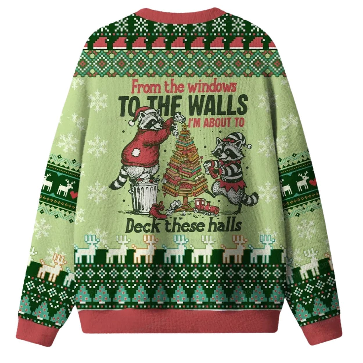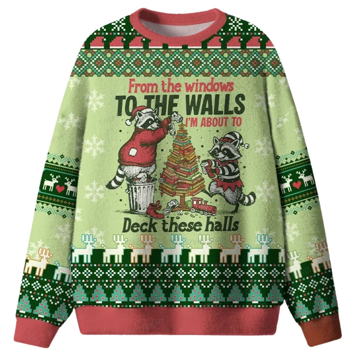 | Design Feature | Full-coverage “ugly sweater” print featuring raccoons decorating a tree and the slogan: “I’M ABOUT TO DECK THESE HALLS.” |