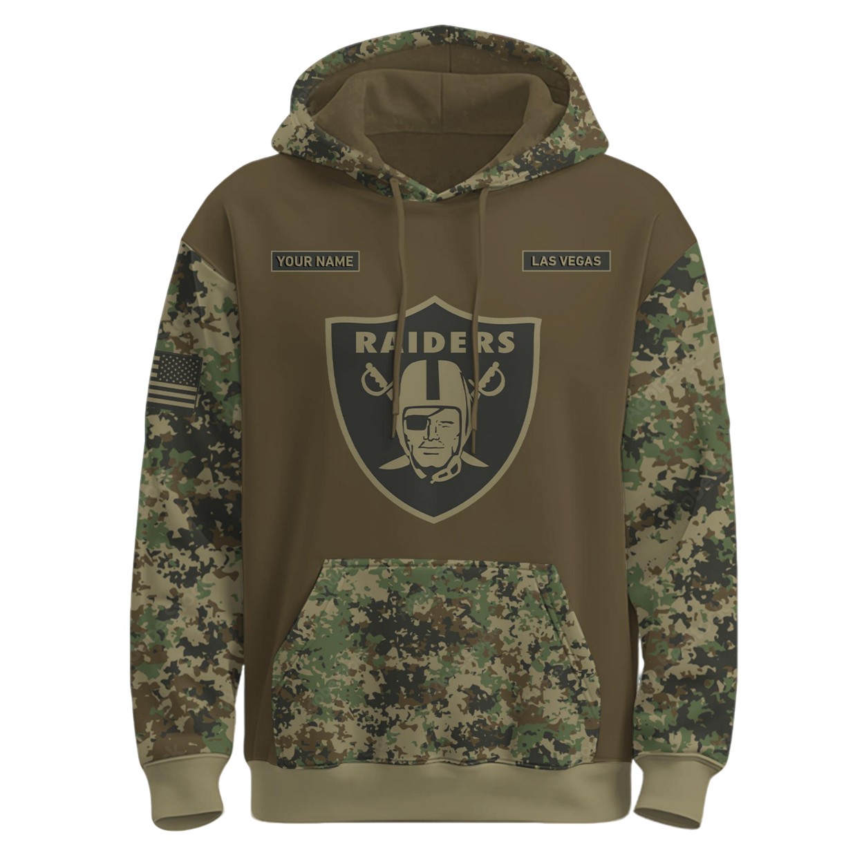 - The front features the iconic Raiders shield logo, accompanied by “YOUR NAME” and “LAS VEGAS” design, with a U.S. flag proudly displayed on the sleeve.
