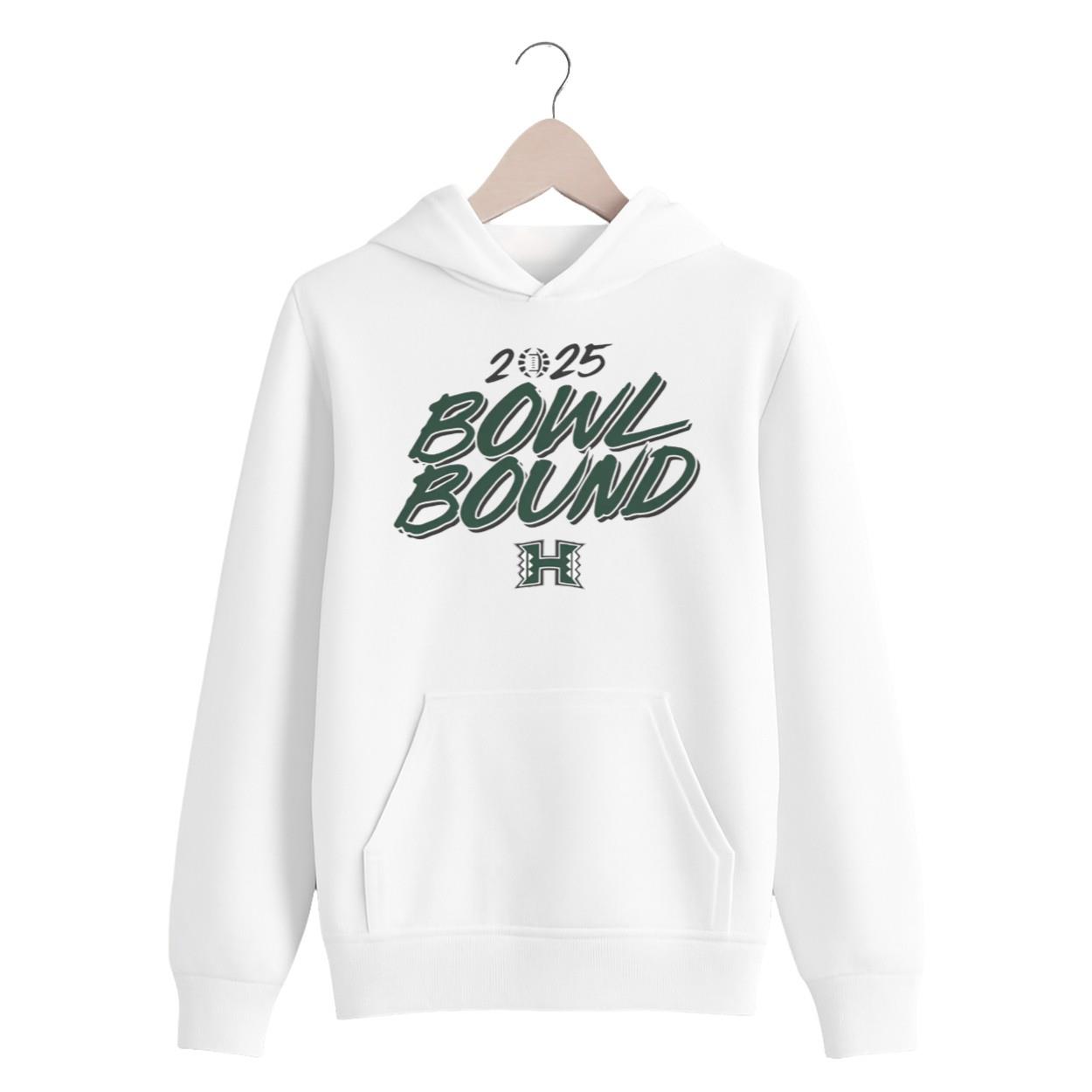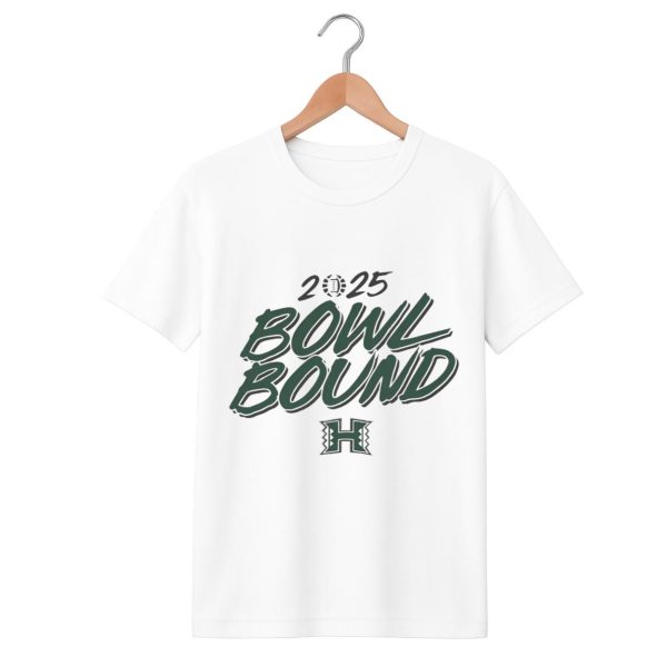 | Design Feature | Single-sided graphic featuring “2025 BOWL BOUND” and the Rainbow Warriors “H” logo in green and black on a white tee. |