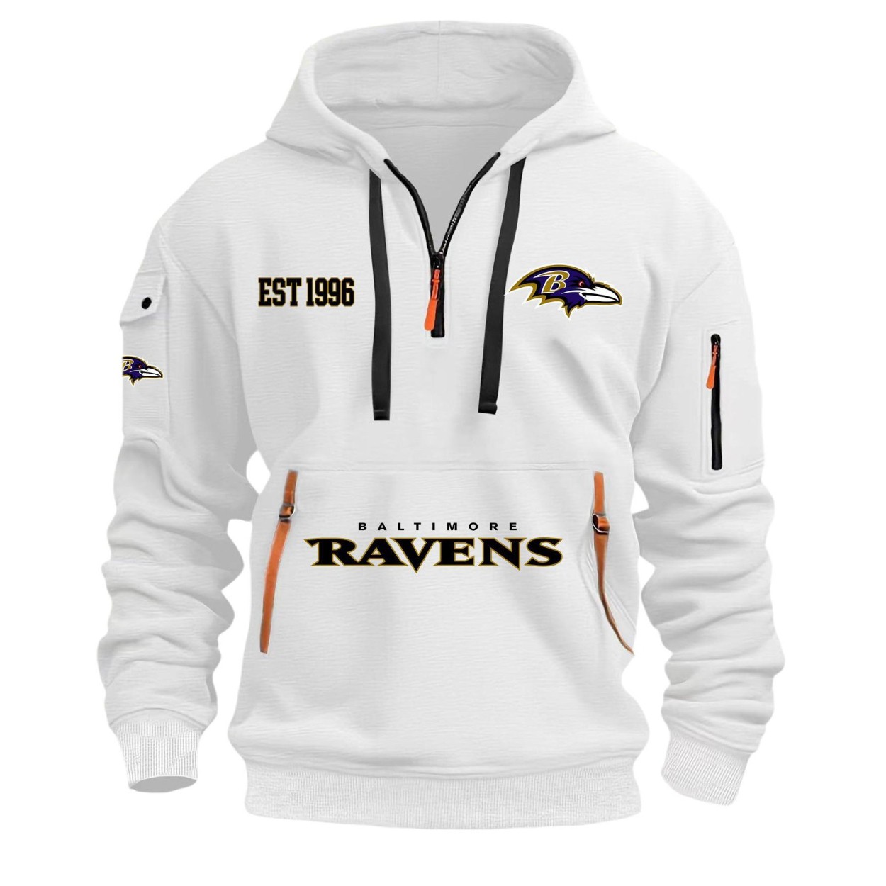 Featuring the team’s founding year, “EST 1996,” and the iconic Ravens head logo on the chest. The design stands out with its contemporary quarter-zip neckline, a zippered utility pocket on the left sleeve, and a flap pocket on the right for added function and style. The main kangaroo pocket, emblazoned with “BALTIMORE RAVENS,” is finished with unique, rugged pull tabs that add a distinctive touch. Available in a variety of colors—from classic white and black to bold royal blue—you can pick the perfect shade to represent your team.